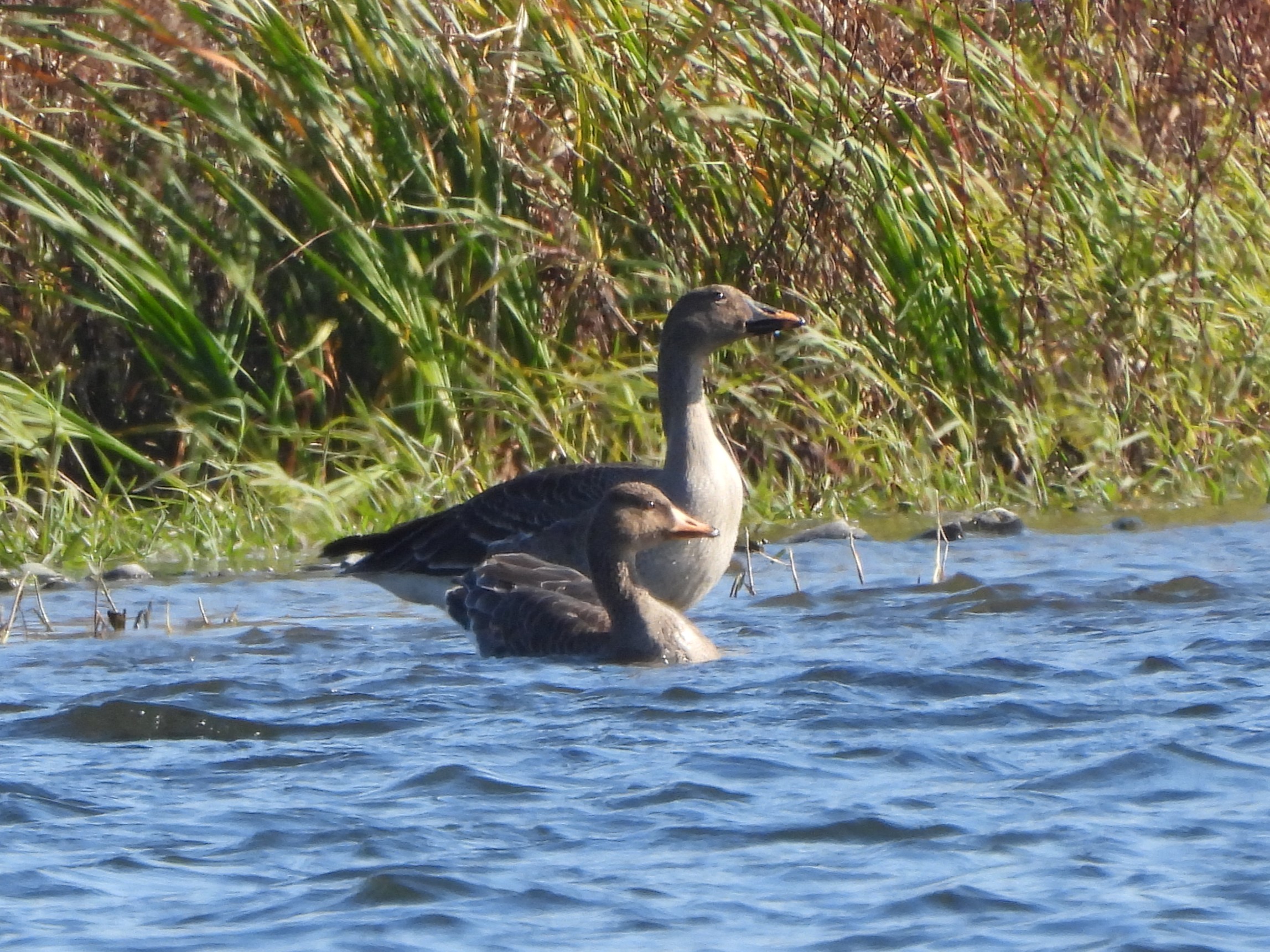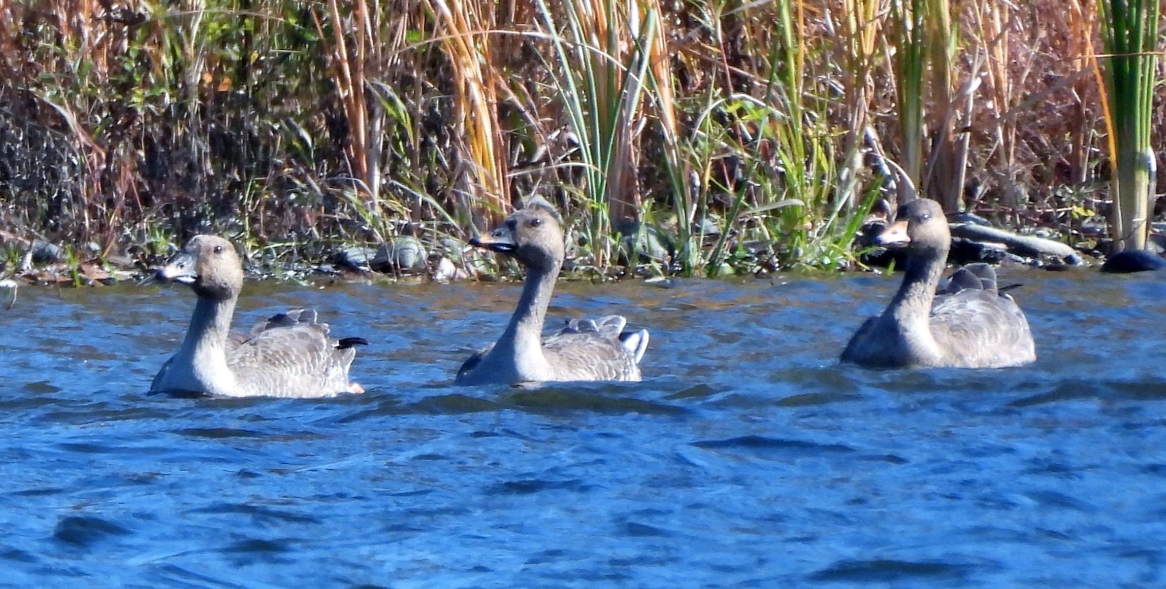 なかなか見つからなかったけど、対岸に大きな塊が3個、動きがあり、ズームしてみると、オオヒシクイでした。