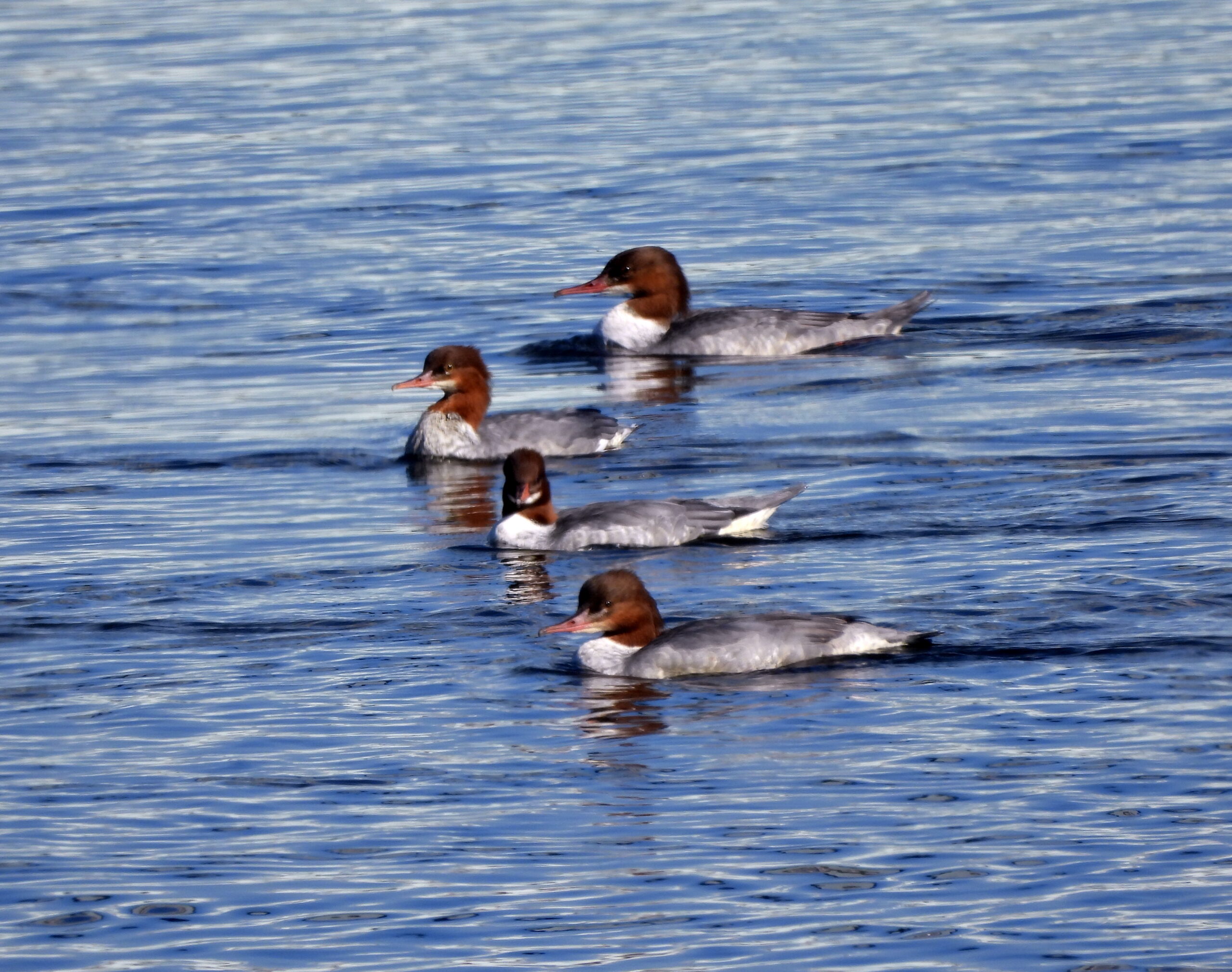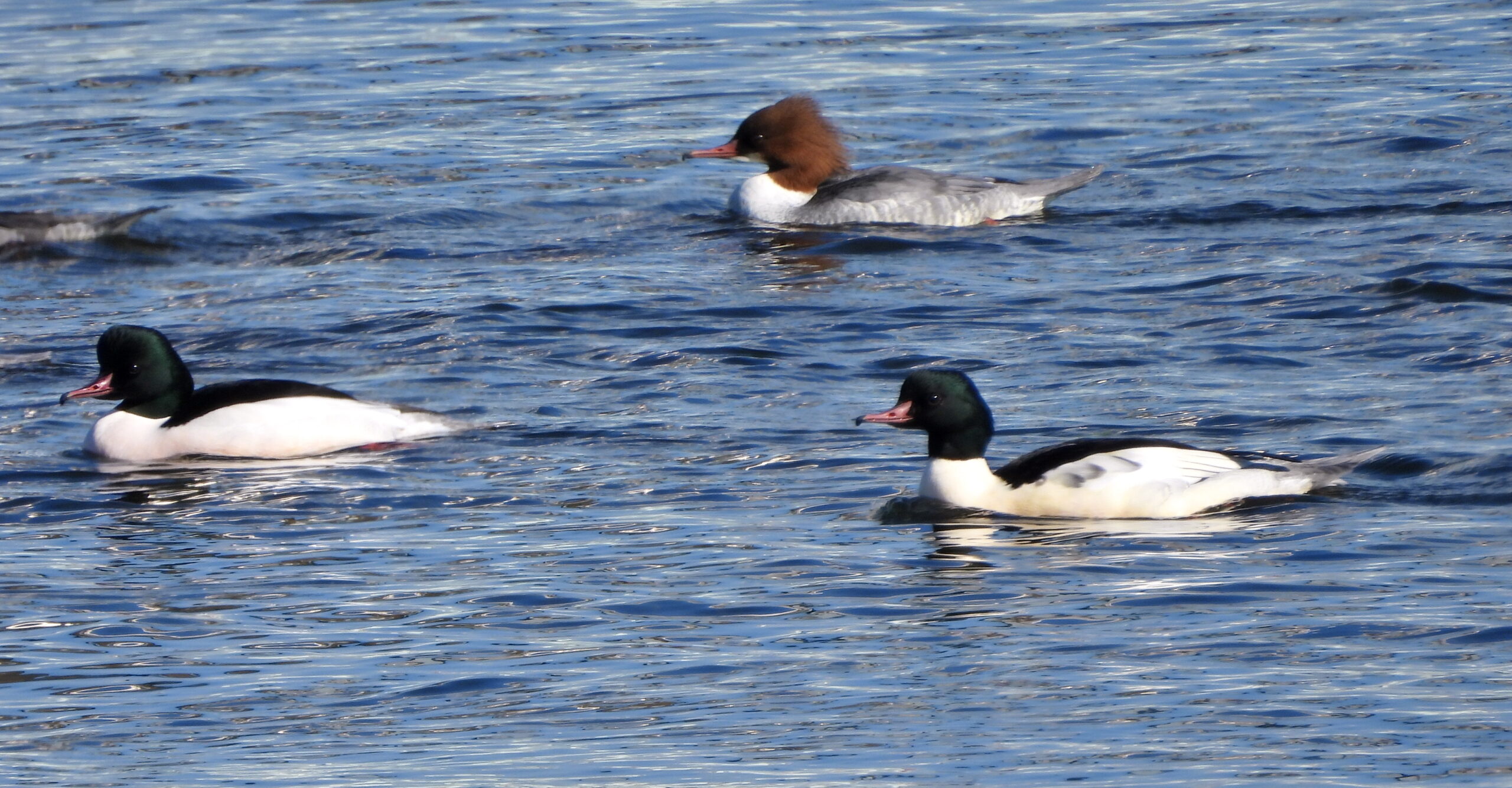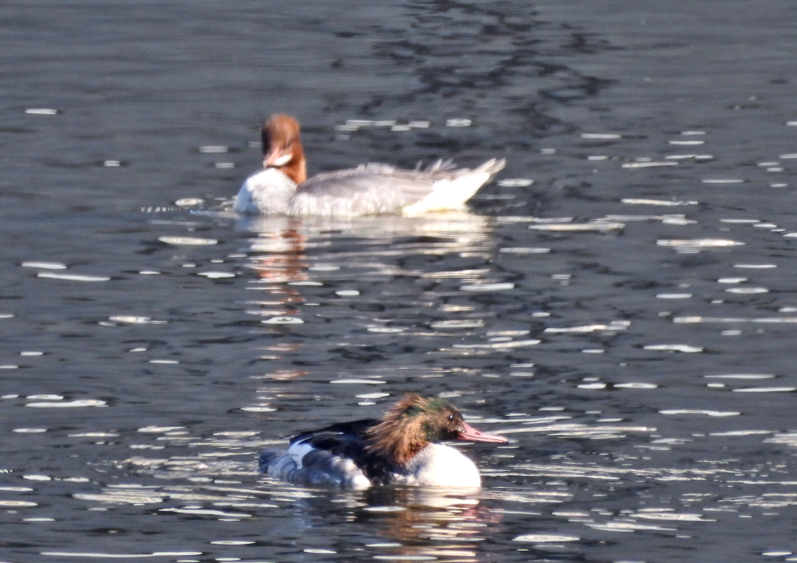 少し歩いた堰辺りでは、沢山のカワアイサが泳いでいました。