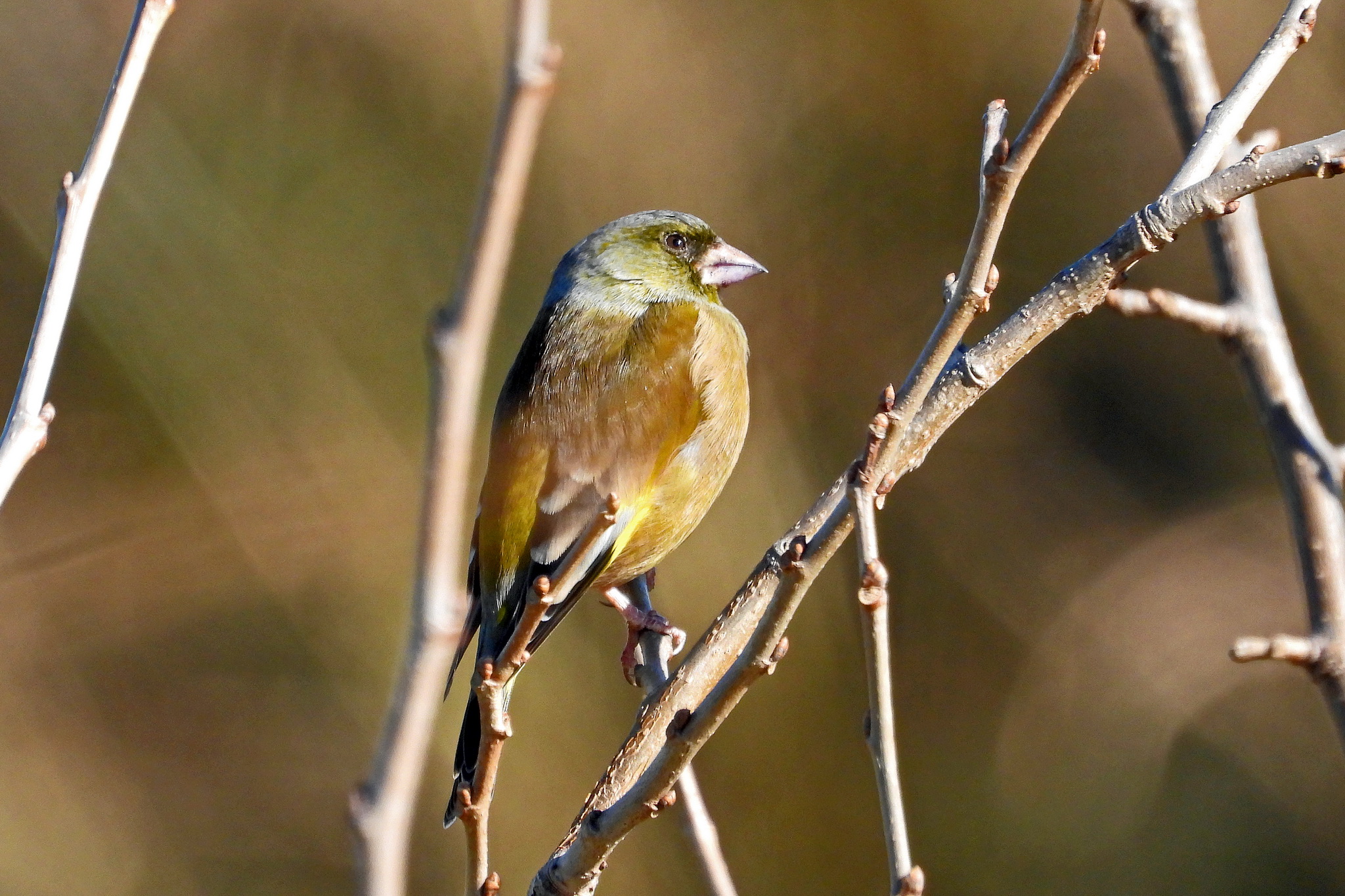 木の中に居るのは「カワラヒワ」のメスですね。