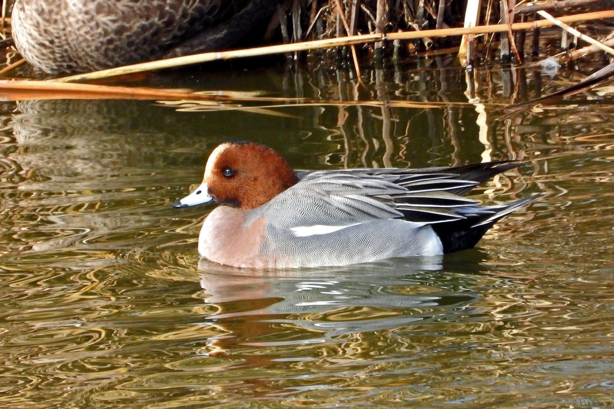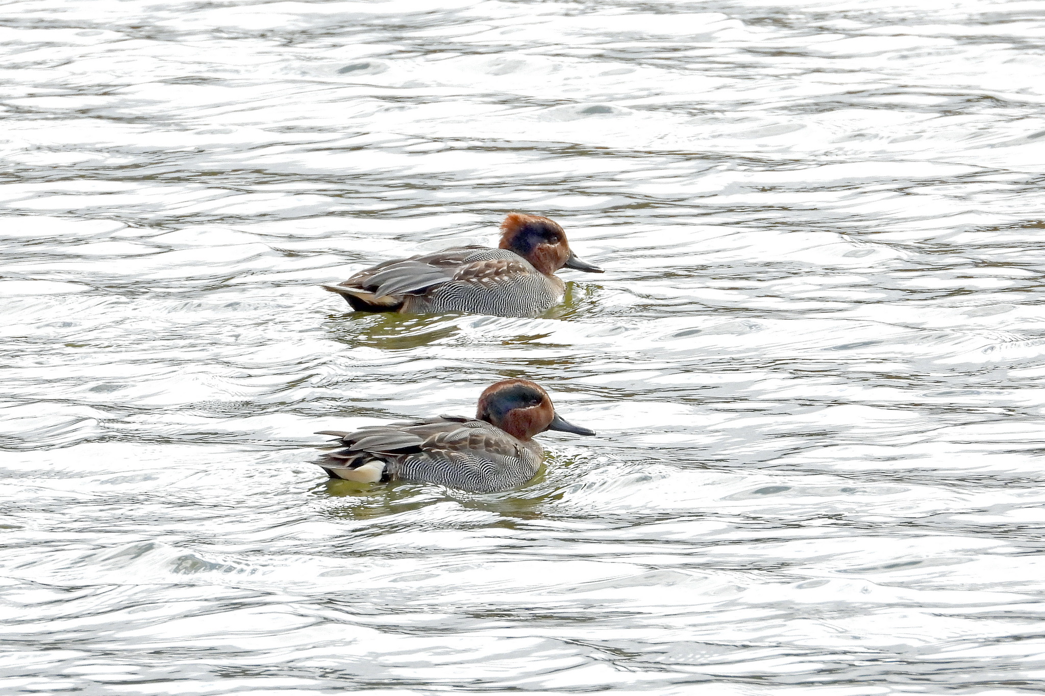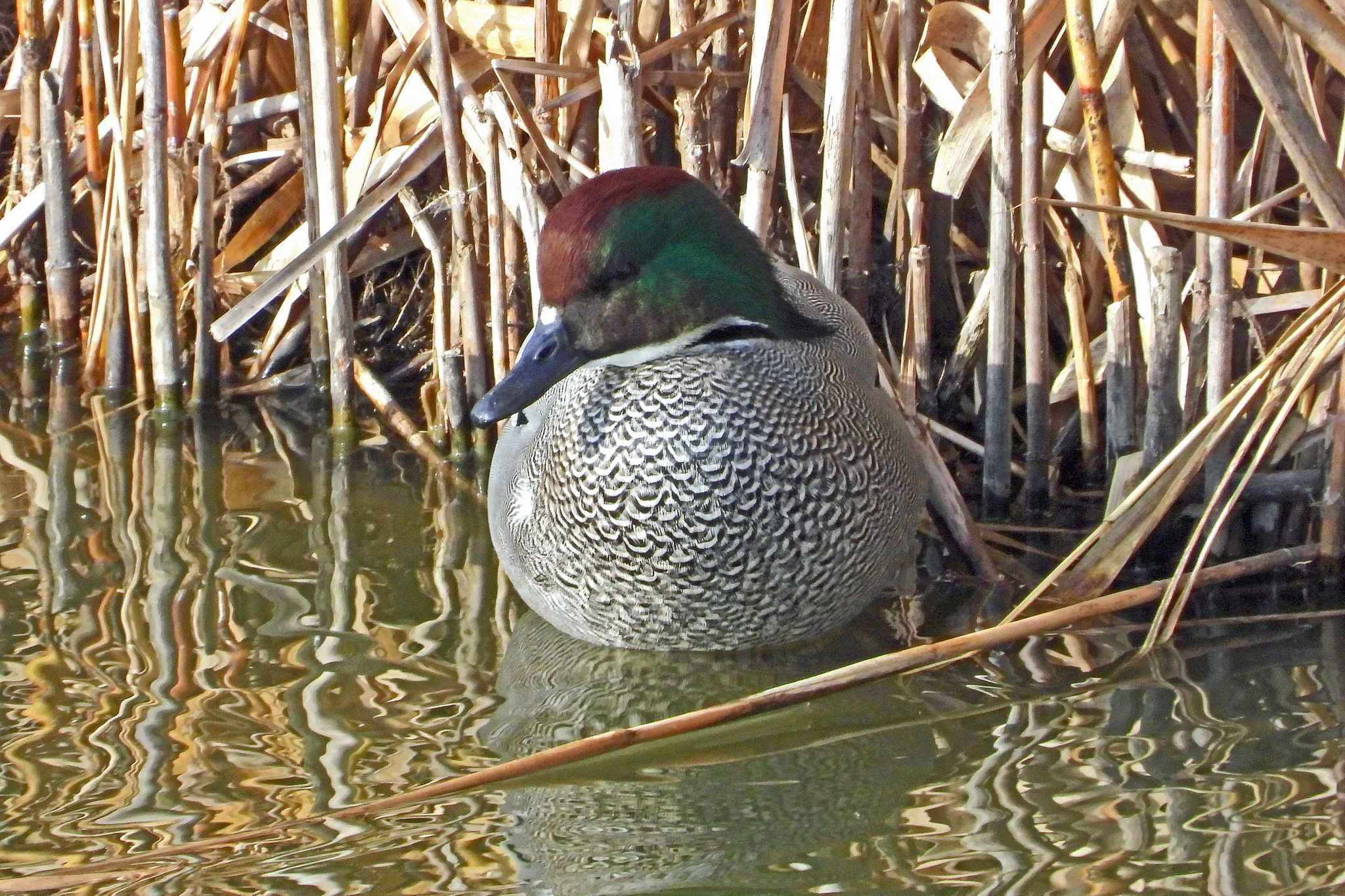 「コガモ」のオスが、二羽泳ぎ出てきました。