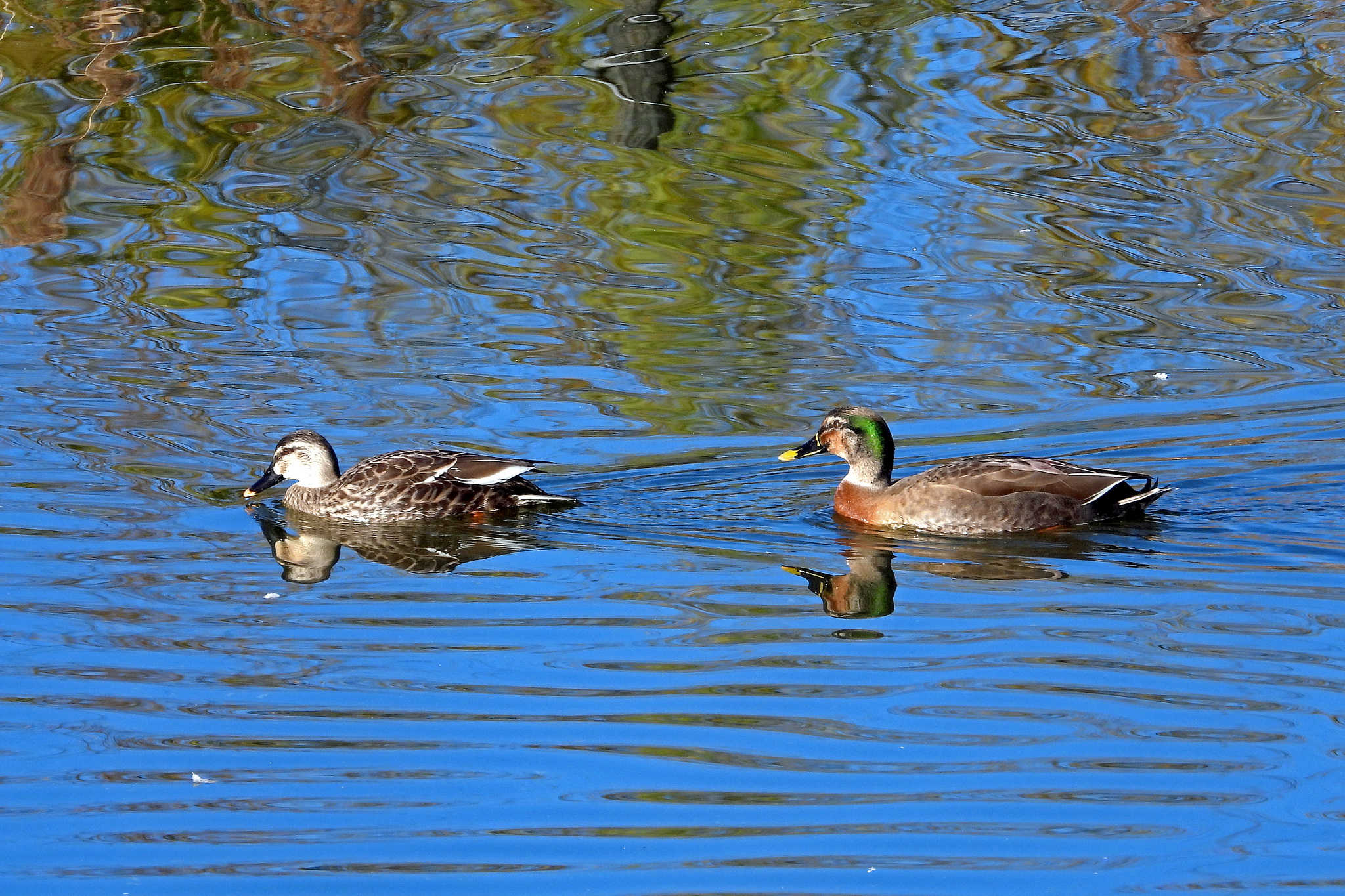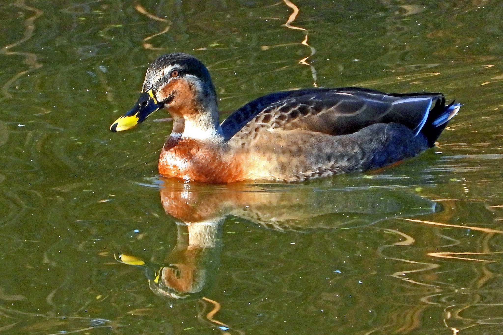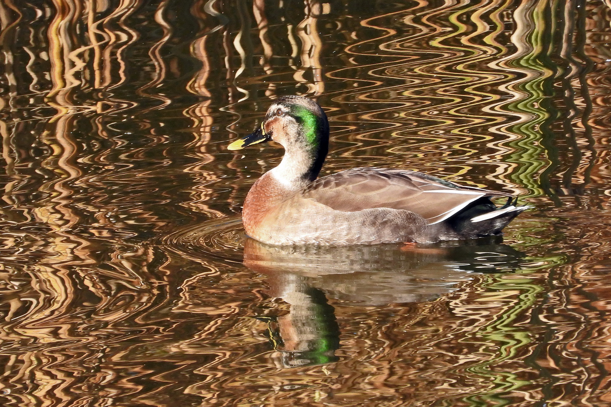 おっ、「カルガモ」を引き連れた交雑種の「マガモ」だ。