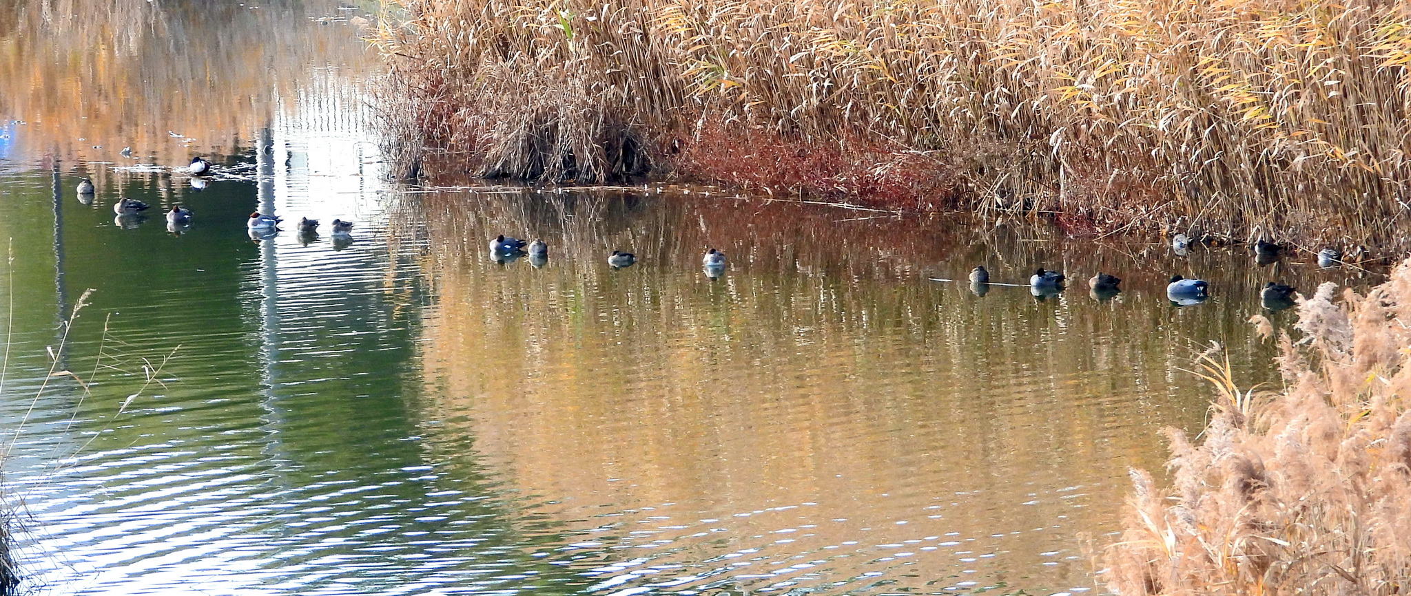 はるか遠くで、カモたちが一列縦隊でうずくまってますね。