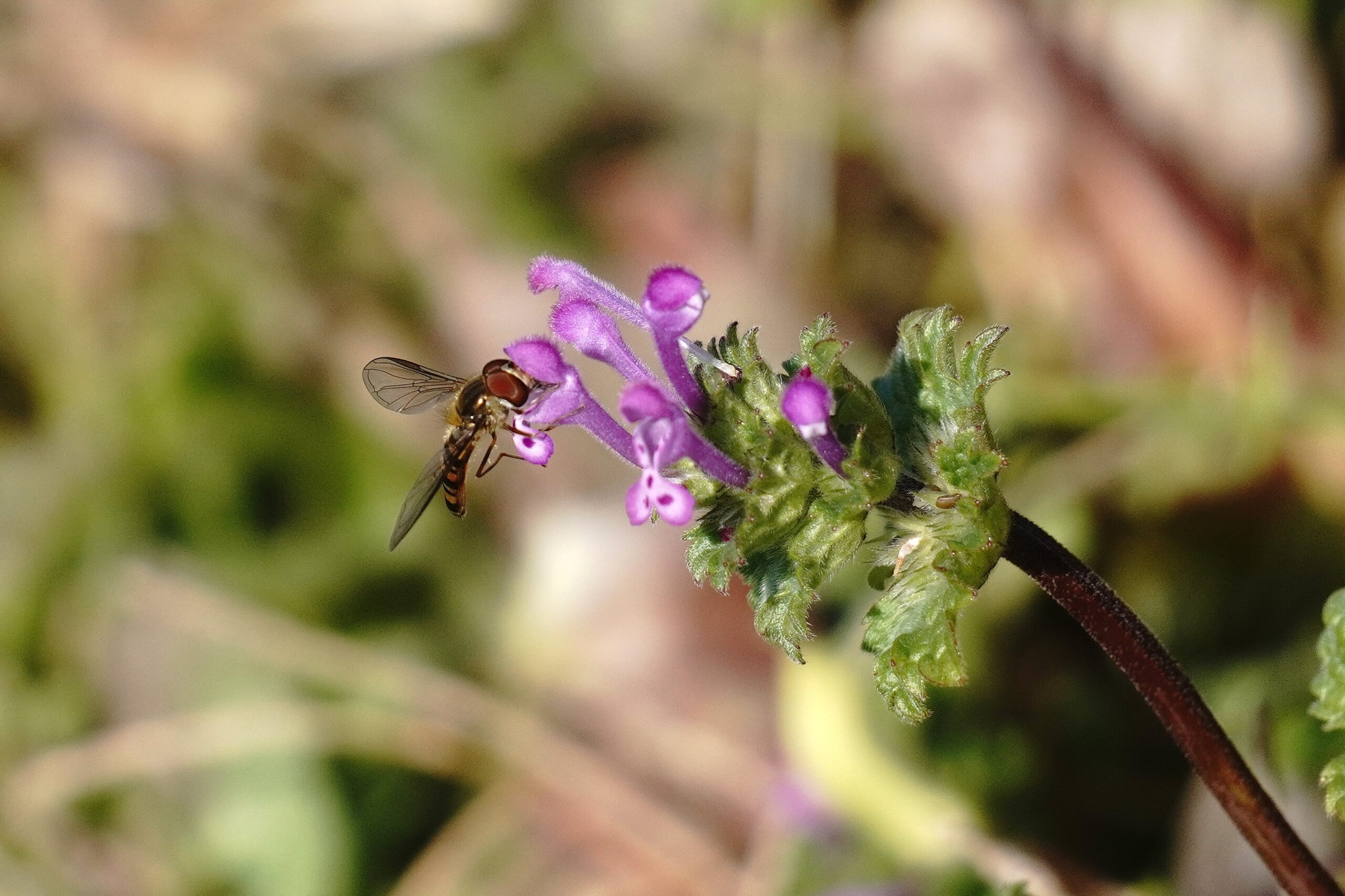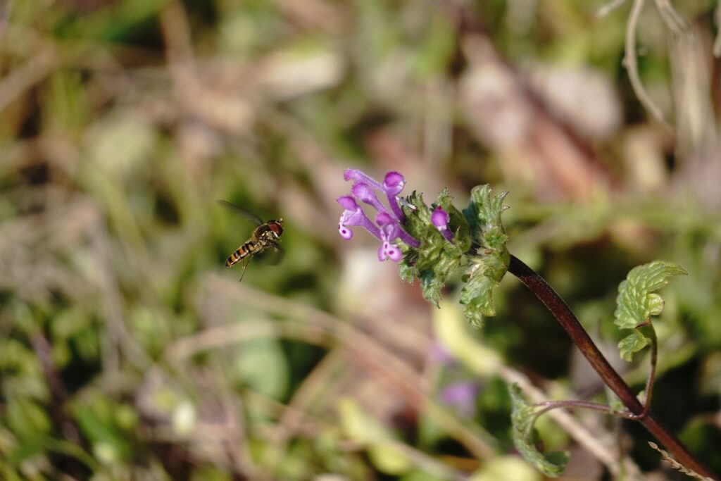 アブの仲間がホトケノザに飛んできました ホソヒラタアブかな
