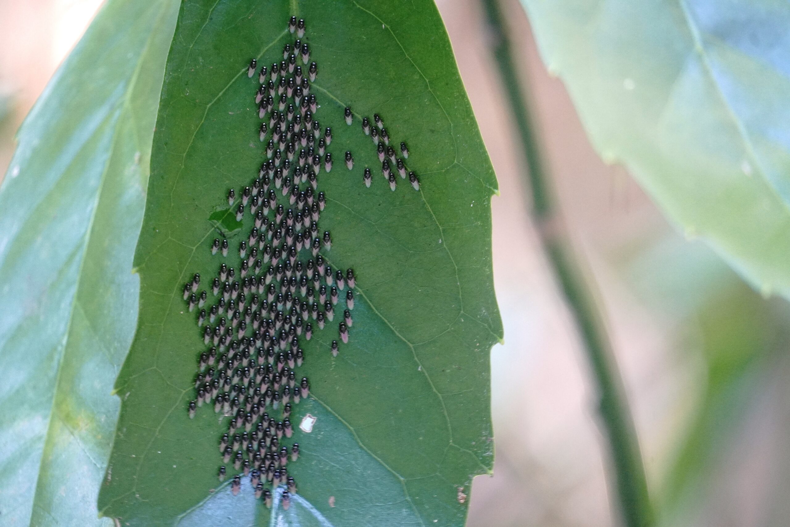 ムラサキツバメ集団越冬 右の葉にも見えますね ムラサキツバメは成虫越冬なので、冬の間集団で塊を作ります