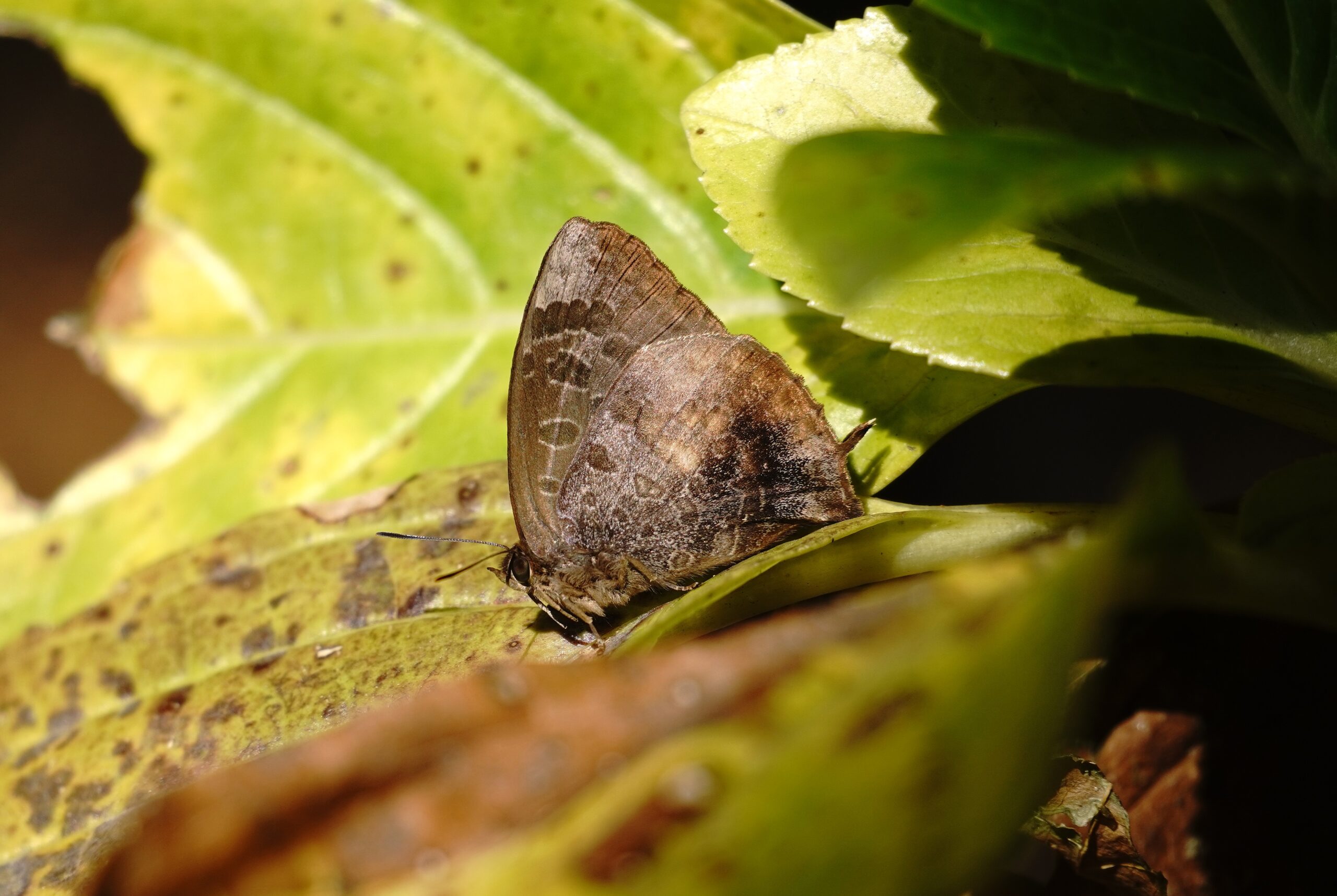 ムラサキツバメ 日差しの当たる葉に止まっていましたが、翅を開いてくれませんでした