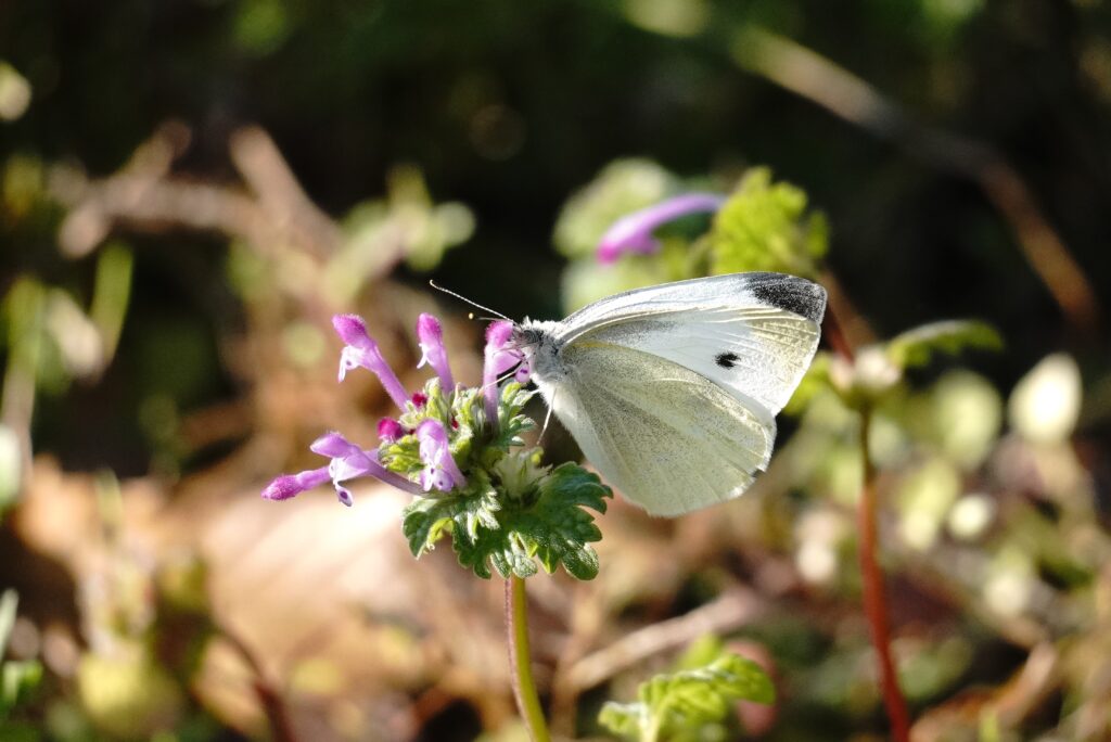 モンシロチョウが、ホトケノザの花で吸蜜