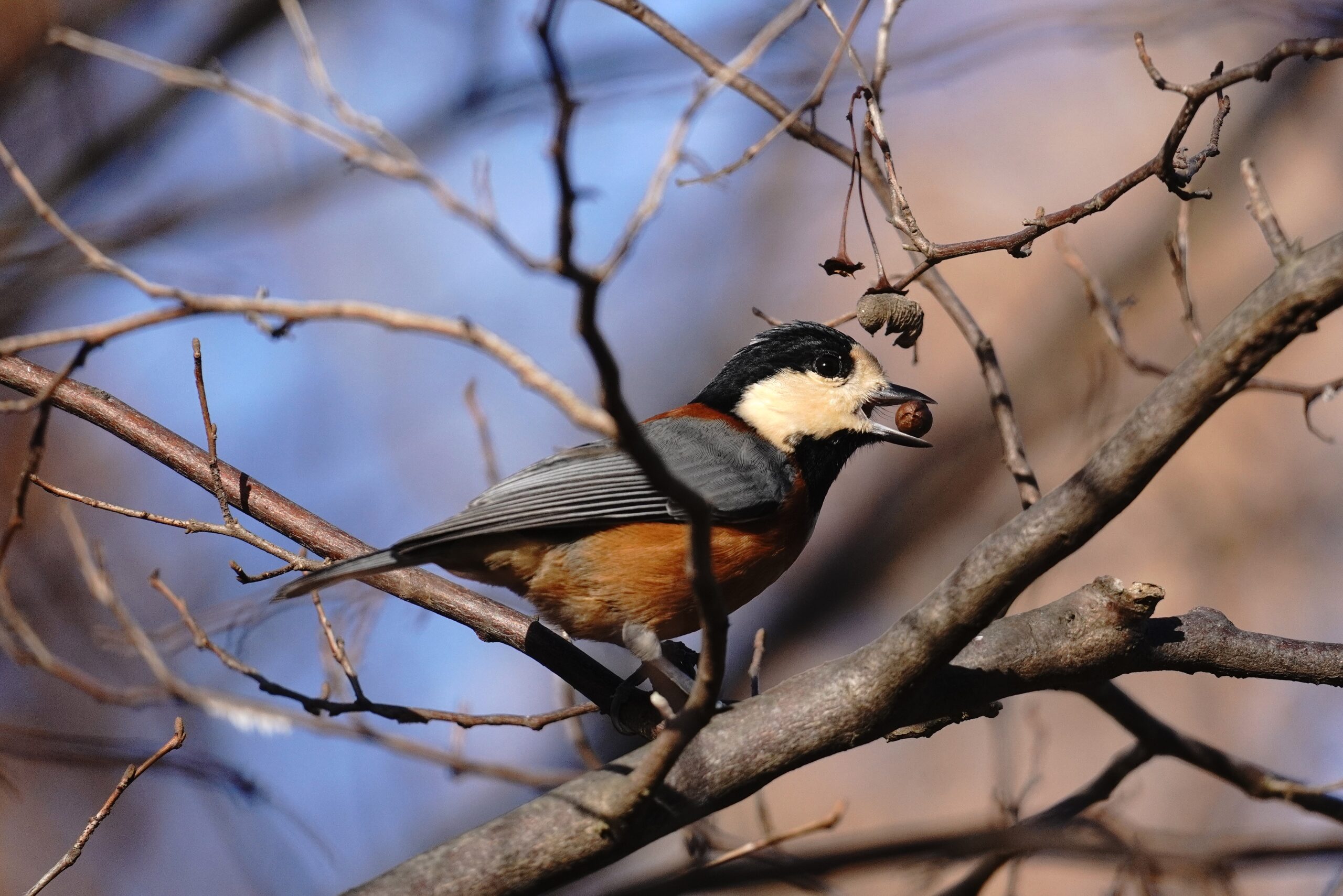 ヤマガラ 残り少ないエゴノキの実を一生懸命採っていました
