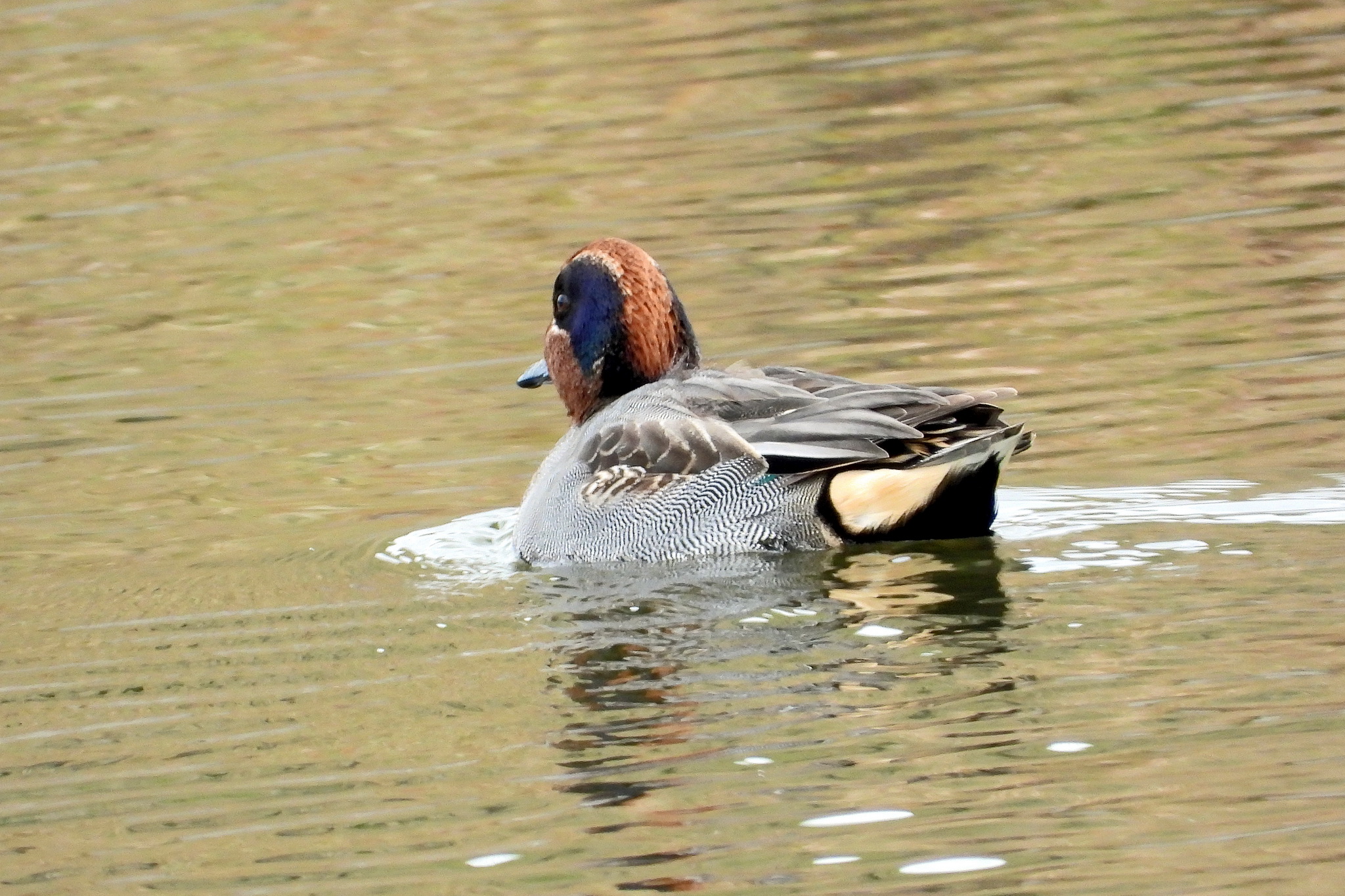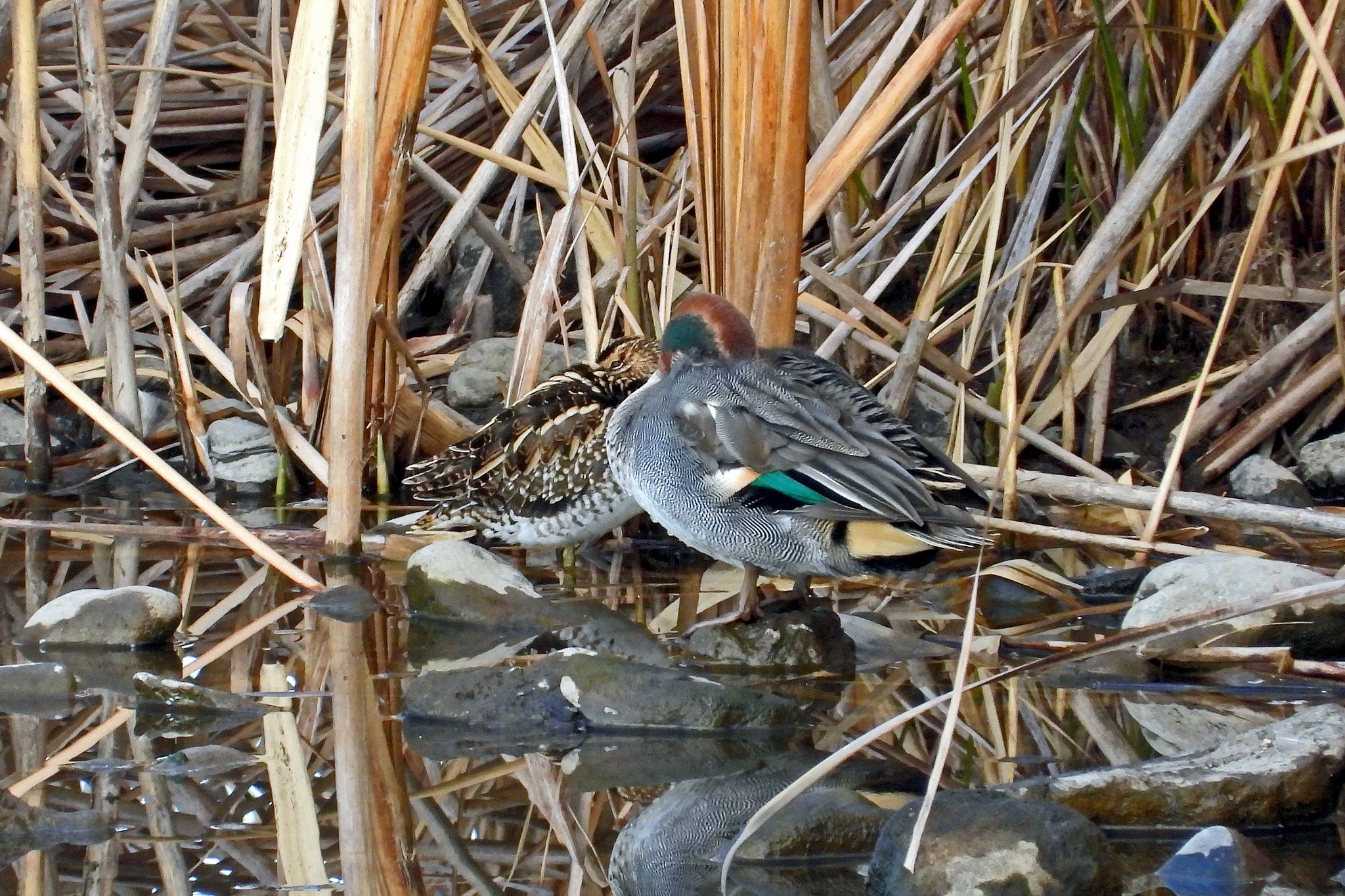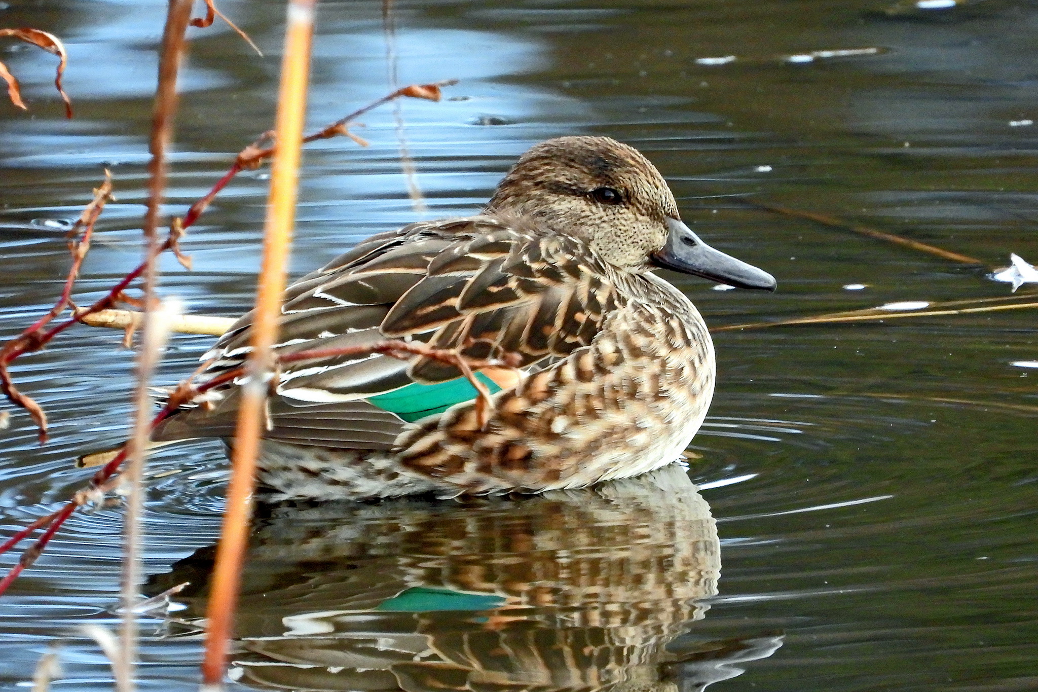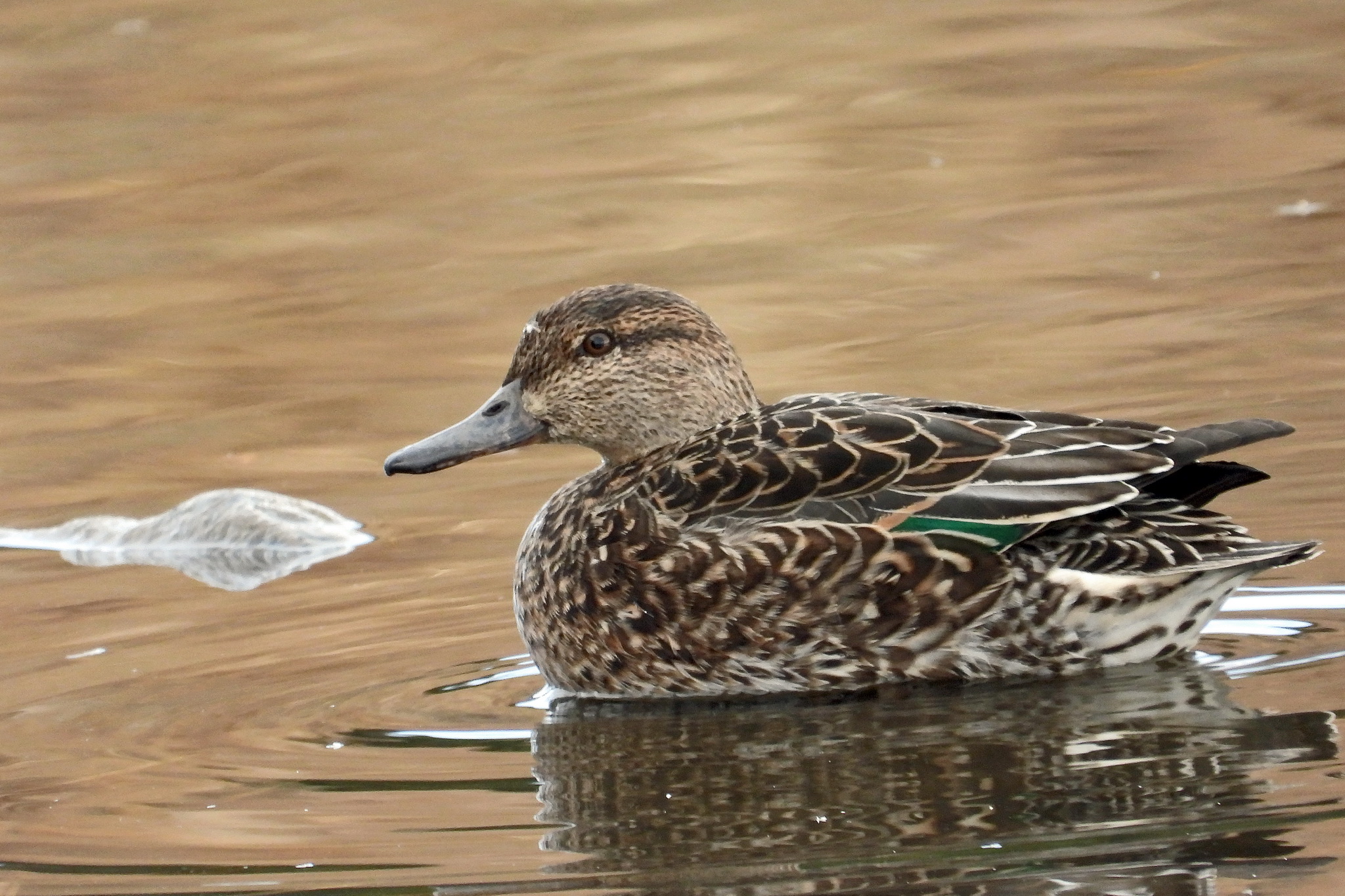 おっ、「コガモ」のメスらしきのが飛んで来て、着水しました。