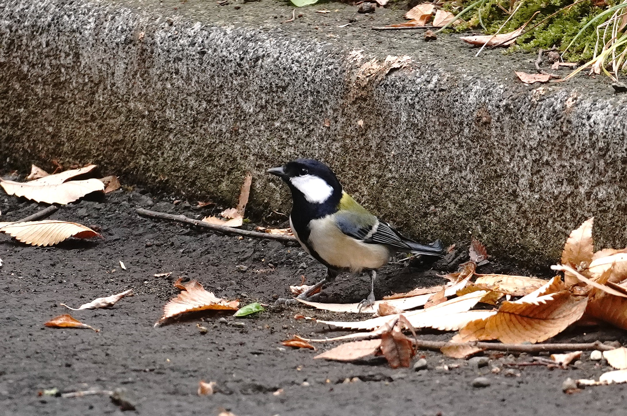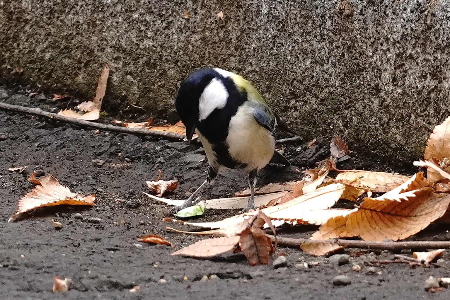 シジュウカラ 下に降りてきました よく見るとカメムシがいますね