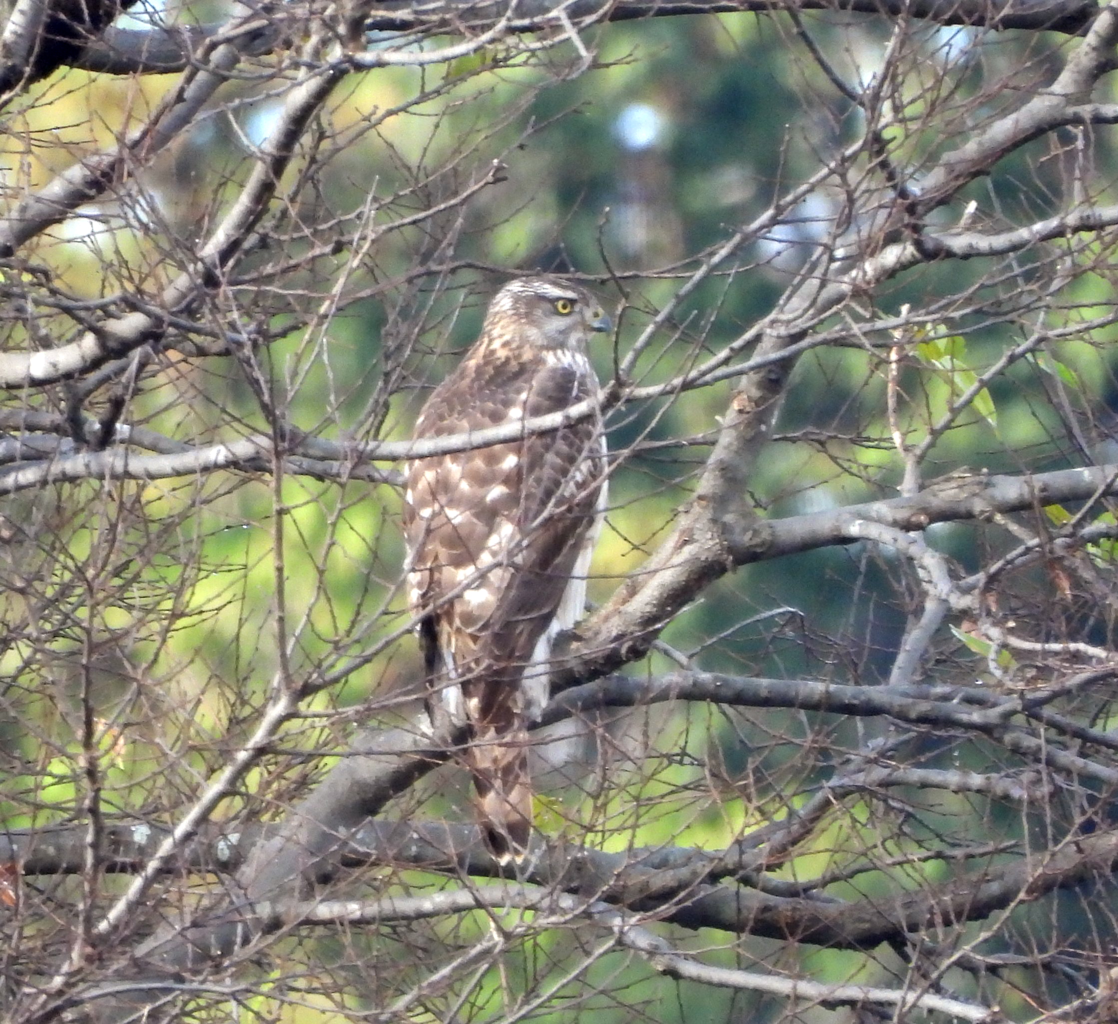 情報センターから、ちょっと遠い枝に猛禽、オオタカか、ハイタカか・・