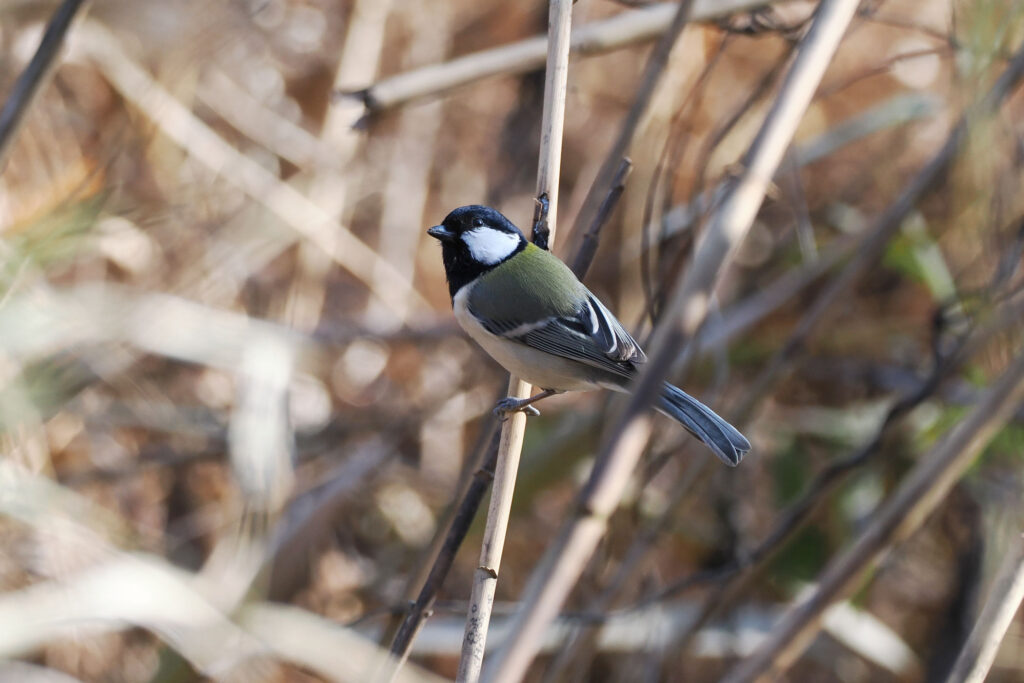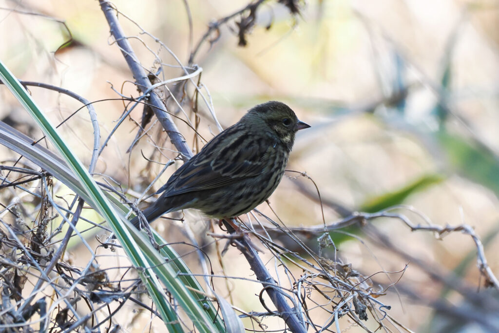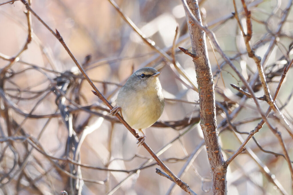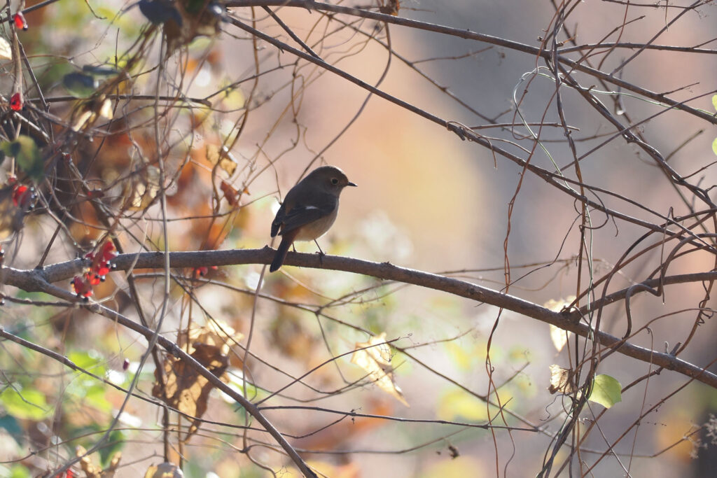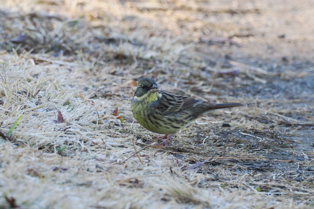 芝生の向こうの枯れ藪に鳥さんの群れが