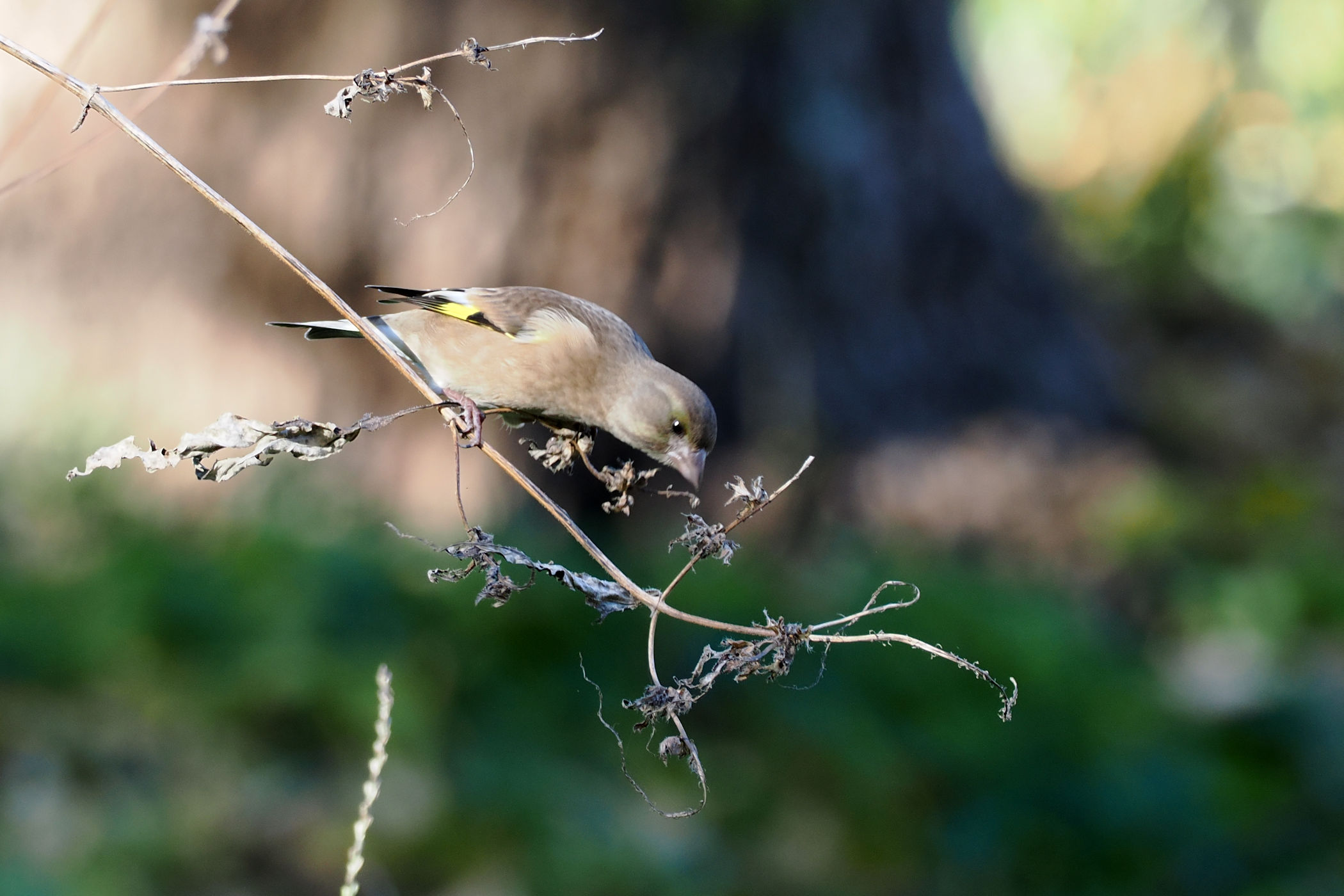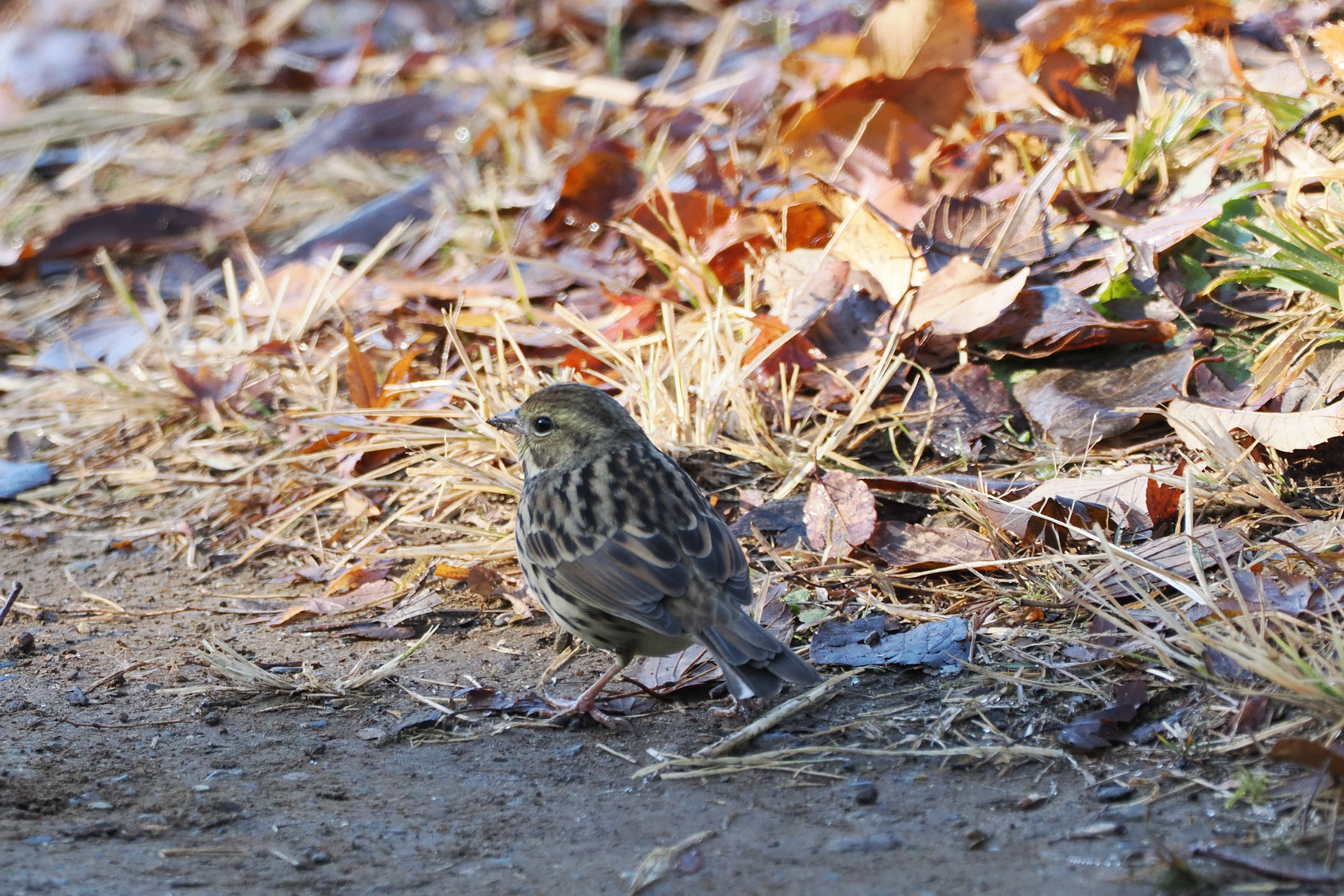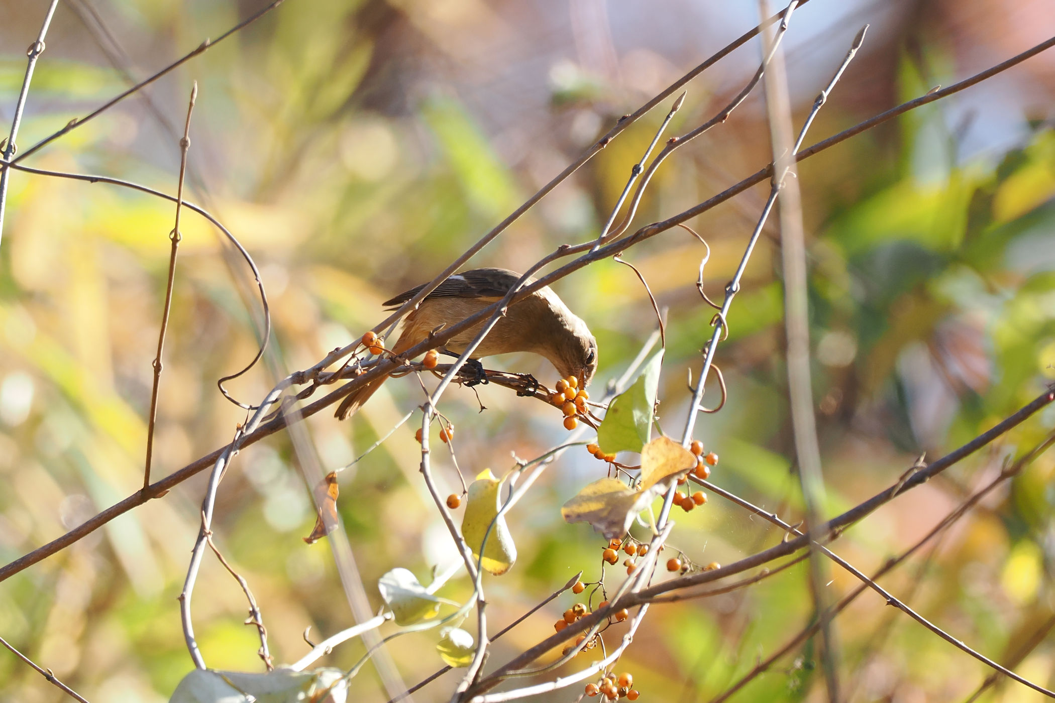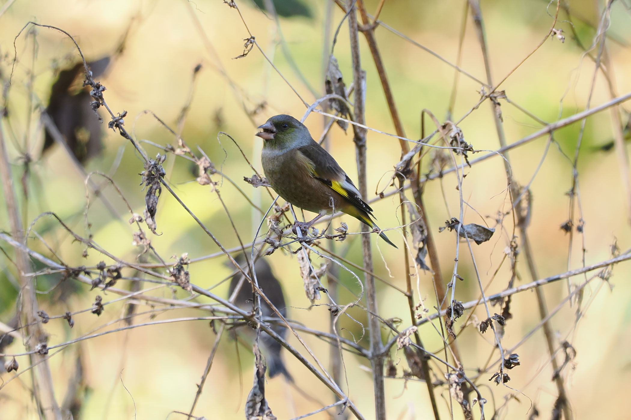 芝生の向こうの枯れ藪に鳥さんの群れが