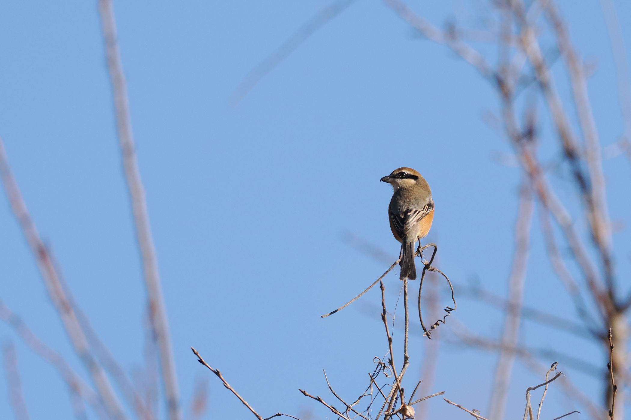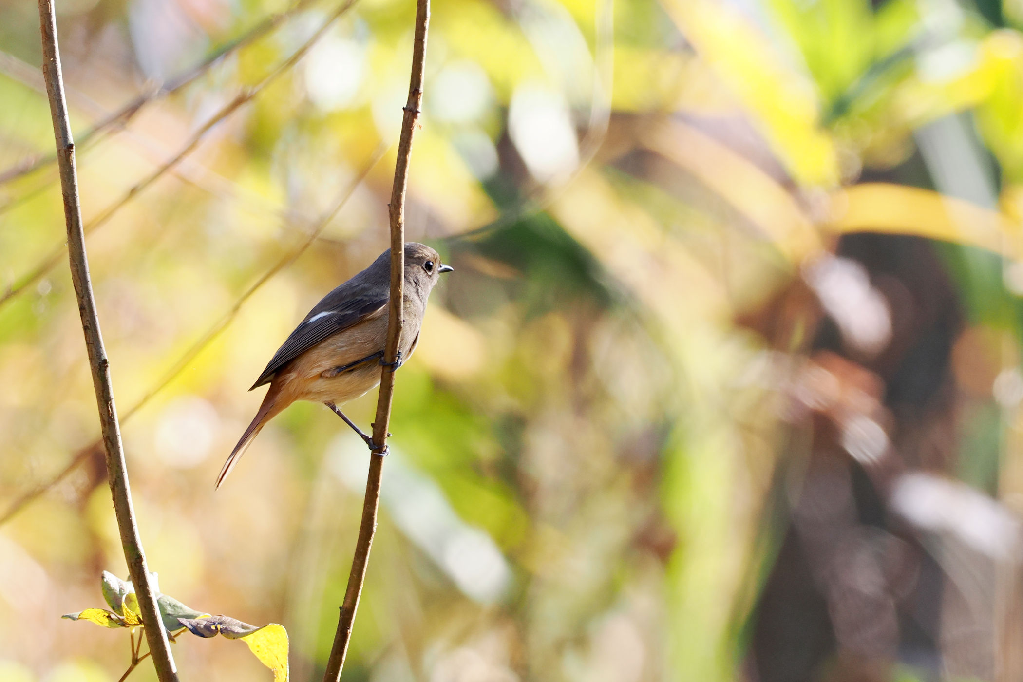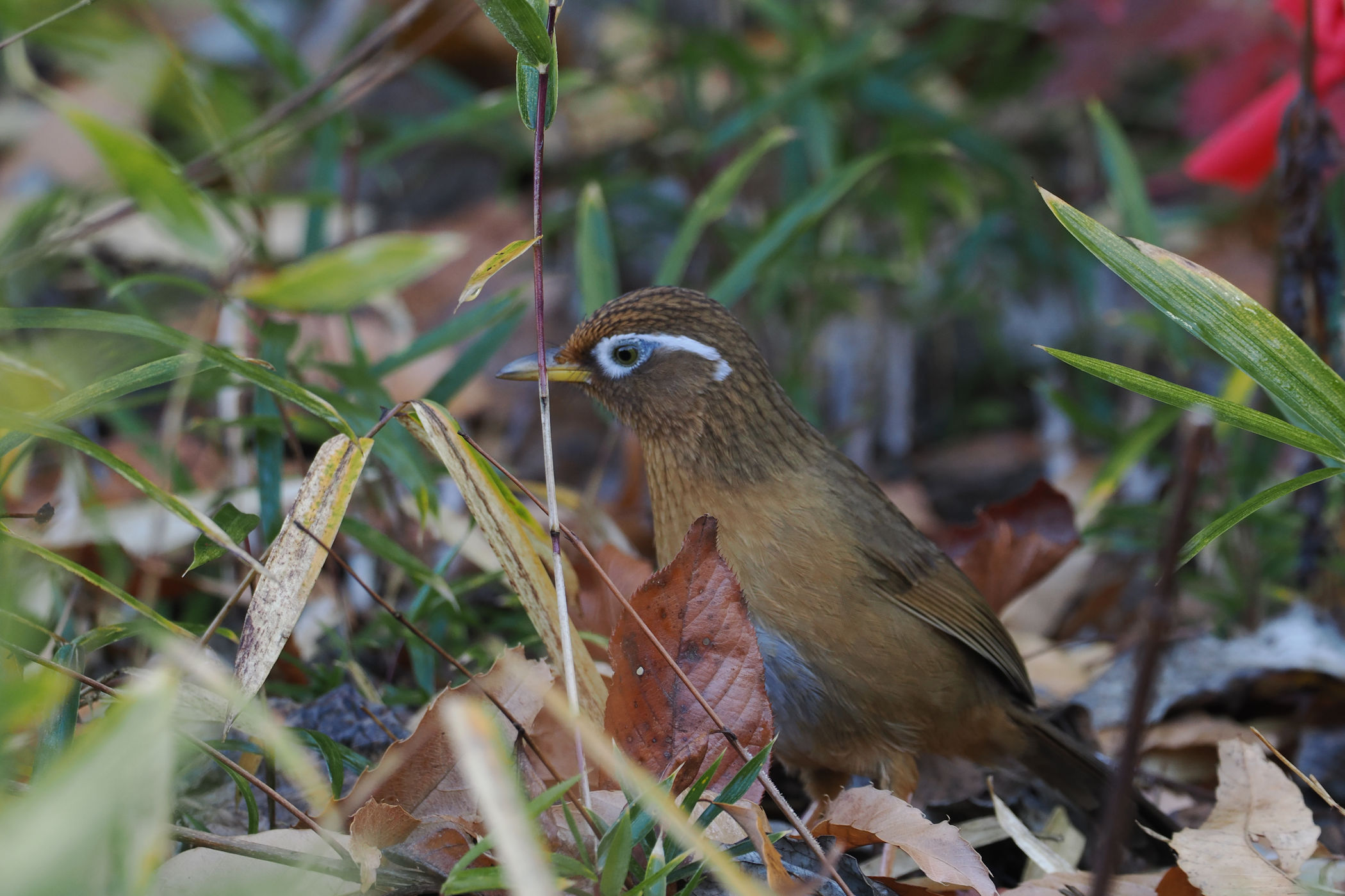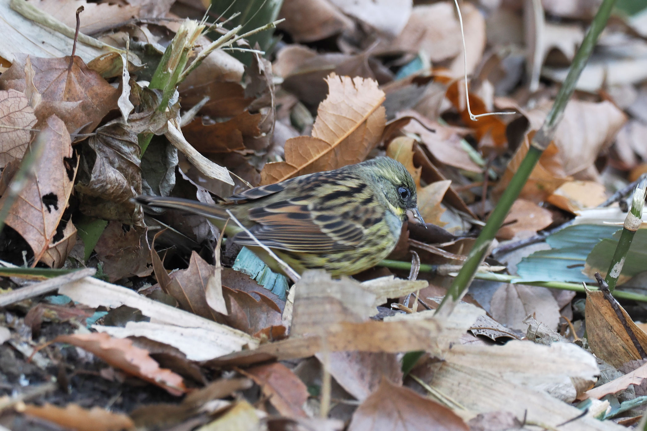 芝生の向こうの枯れ藪に鳥さんの群れが