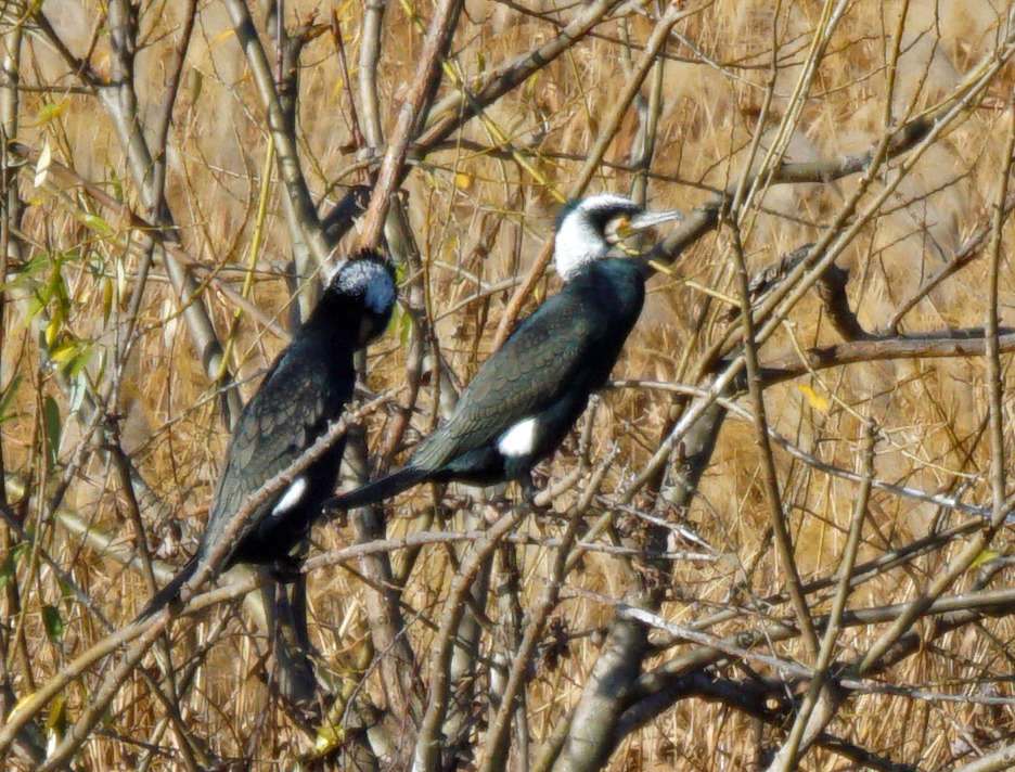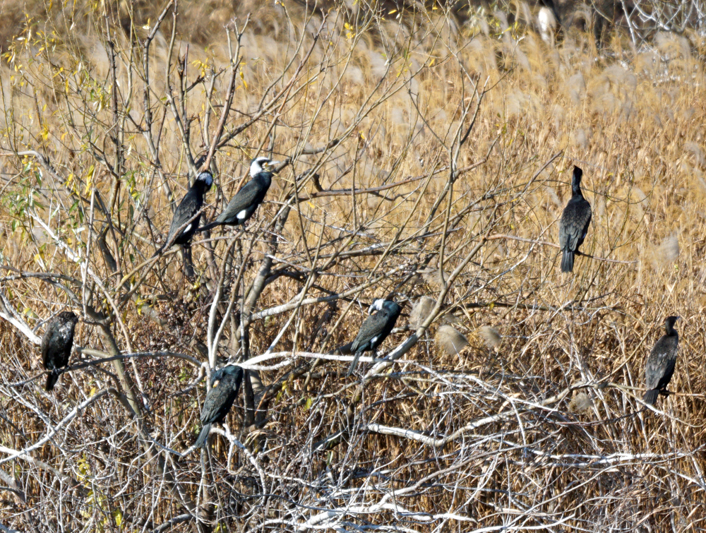 カワウがどっさり。 何本もある葉を落とした枝に、まとまって止まっていました。