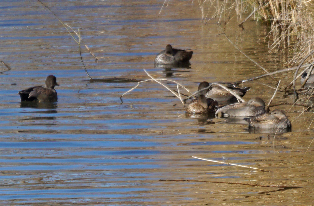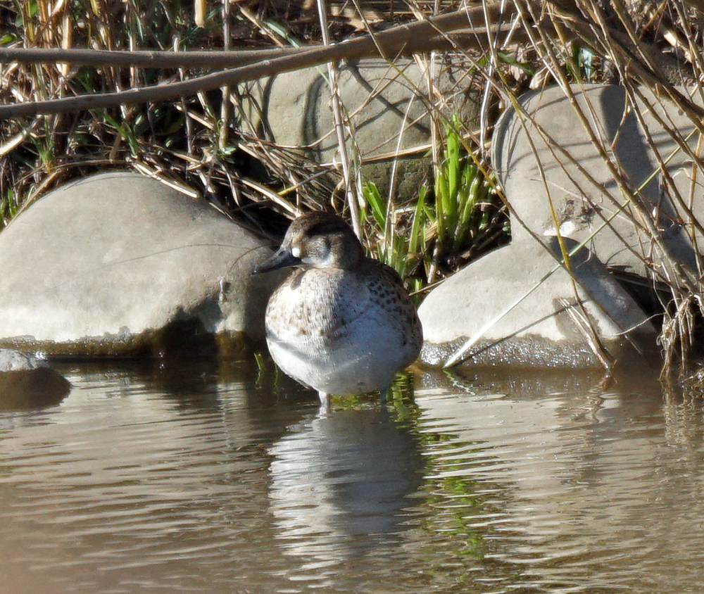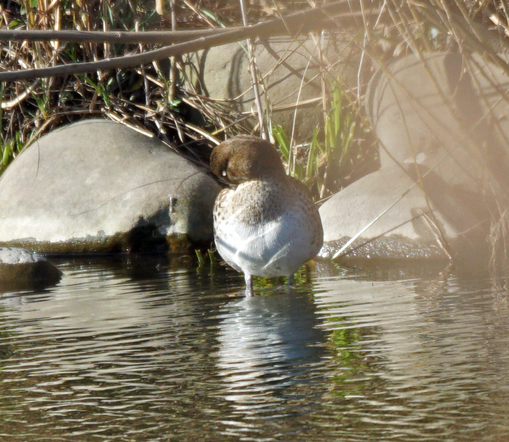 昨日(12 月23日)、姉と行ってみました。 ずいぶん久し振りです。 俣野遊水地で、コガモがいるな、と見ていると、奥の翅繕いをしている1羽がちょっと違う感じ。