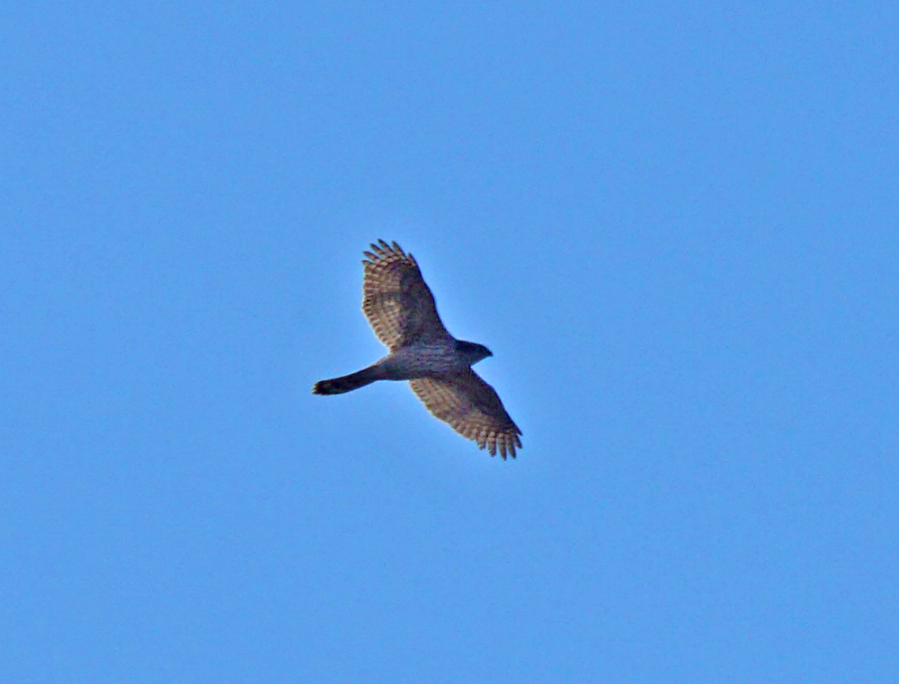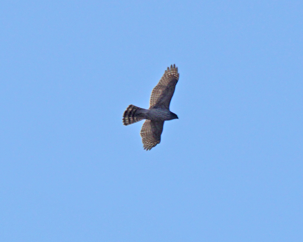 上空をタカが飛びました。 胸に縦斑があって、翼指の突出が少ない、胴ががっしりした感じ、