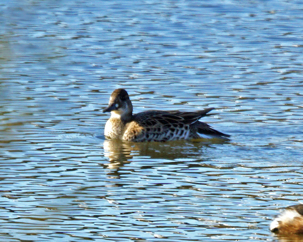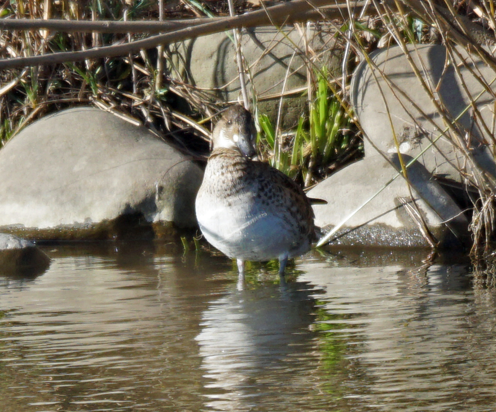 顔を上げると、クチバシの元に白い〇斑。 トモエガモの♀でした。