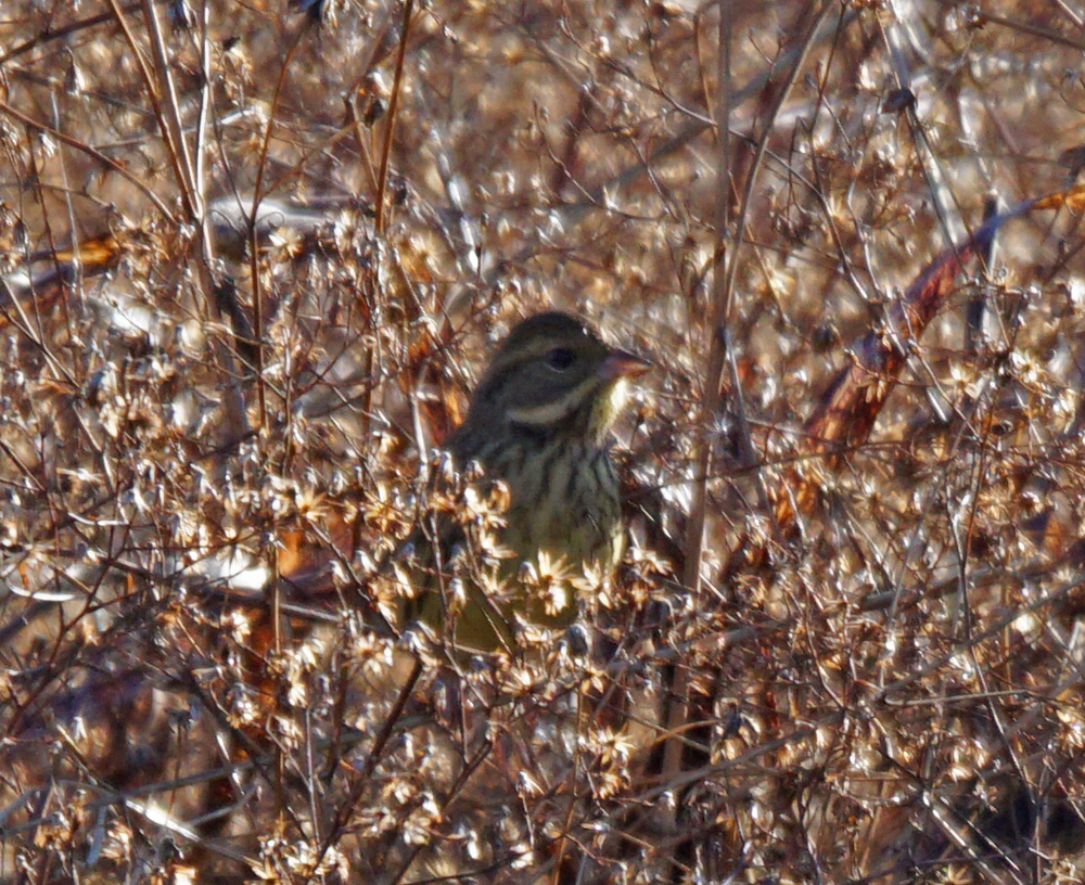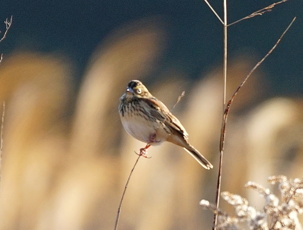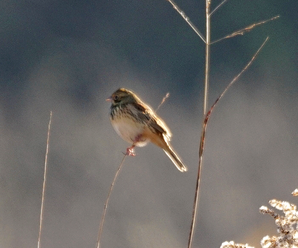 今日は寒いので、遊水地だけ、と思って下へ降りると、我楽多さんが来られていて、ちょっとお話ししていましたが、ホオアカの声が聞こえたので探すと、遠くの茎の先に止まっていました。