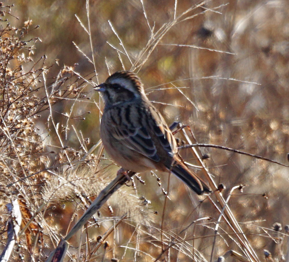 枝先で小さな種を啄んでいるホオジロを見ていると、その下の方で草が揺れて、