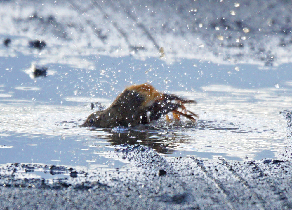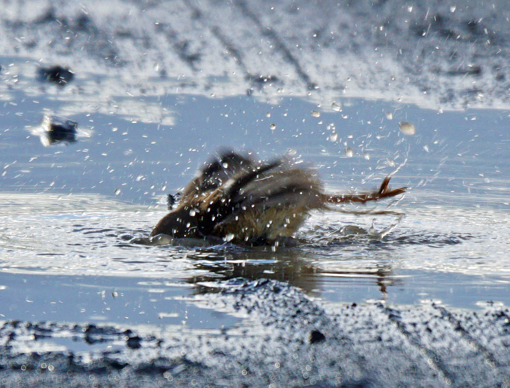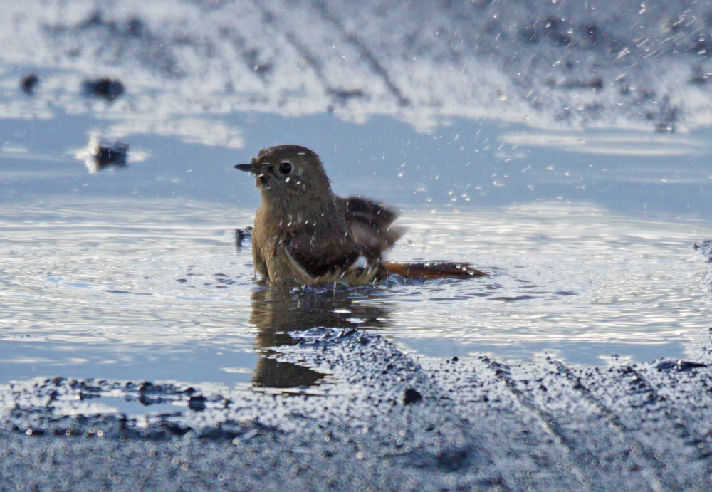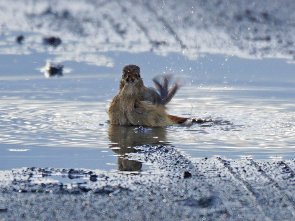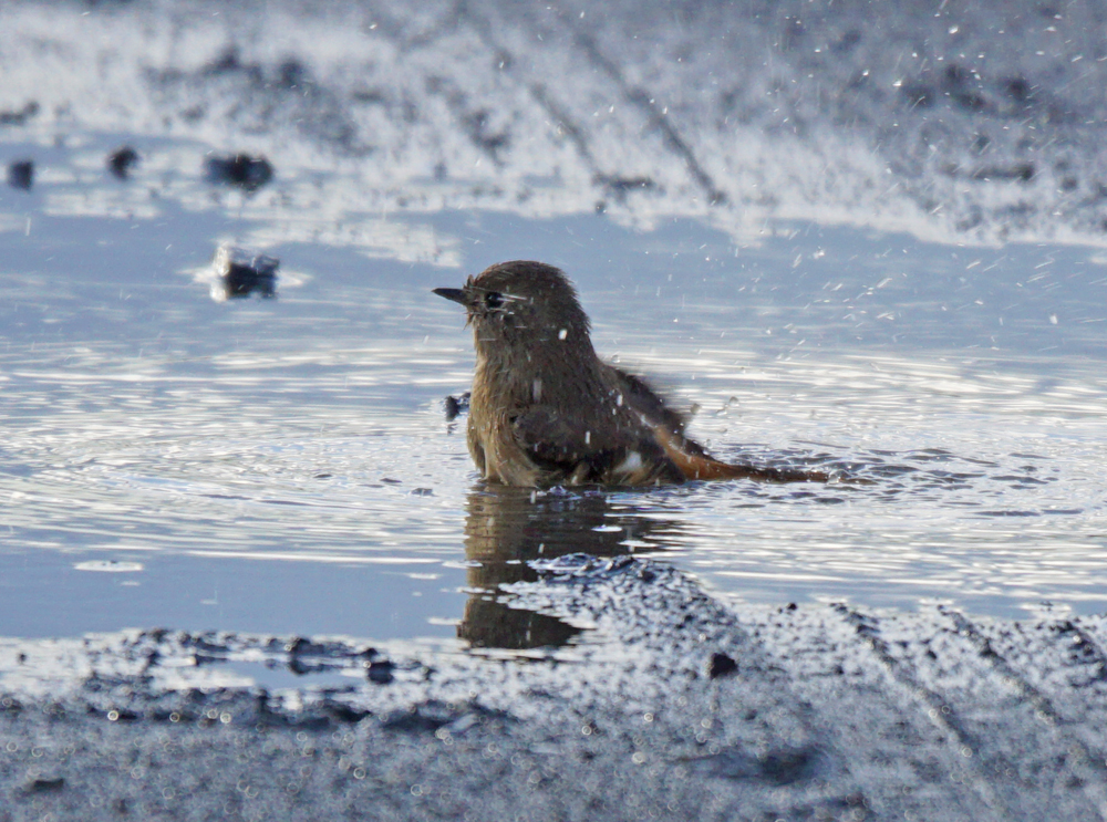 近くにできていた小さな水溜まりに、ジョウビタキがピョンと飛んできて、水浴びを始めました。