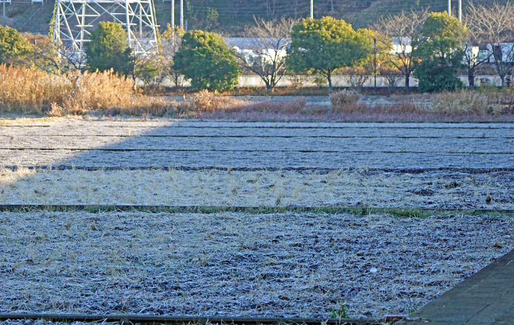 今朝は冷え込んで、同じ時間なのに、田んぼ全体が霜で真っ白になっていました。