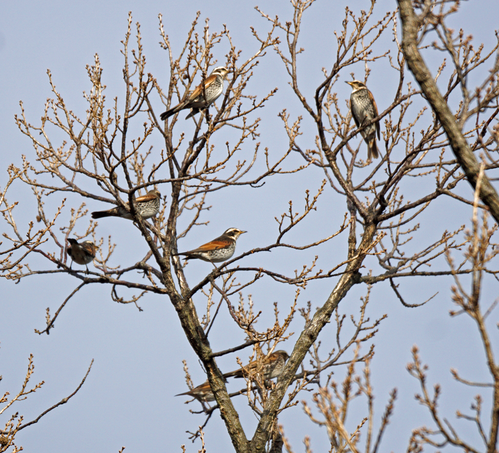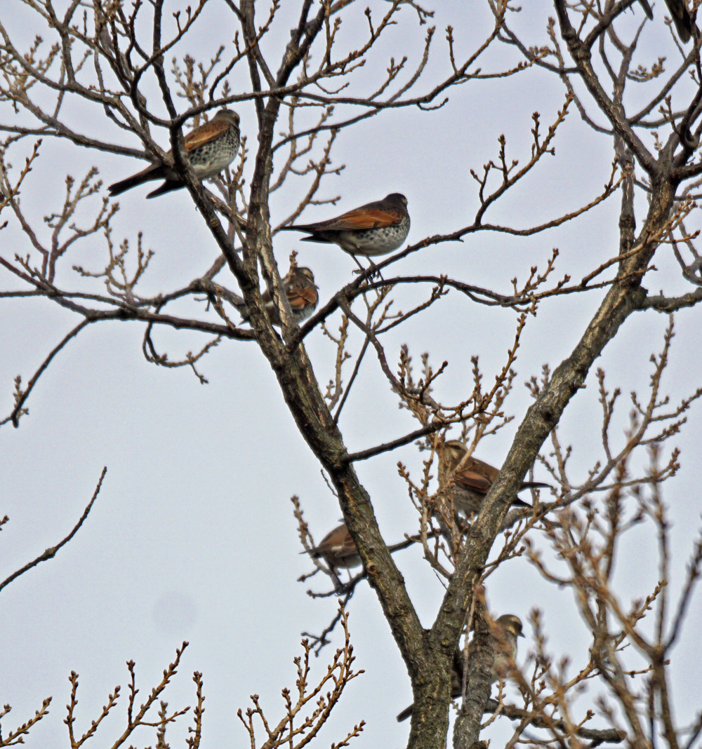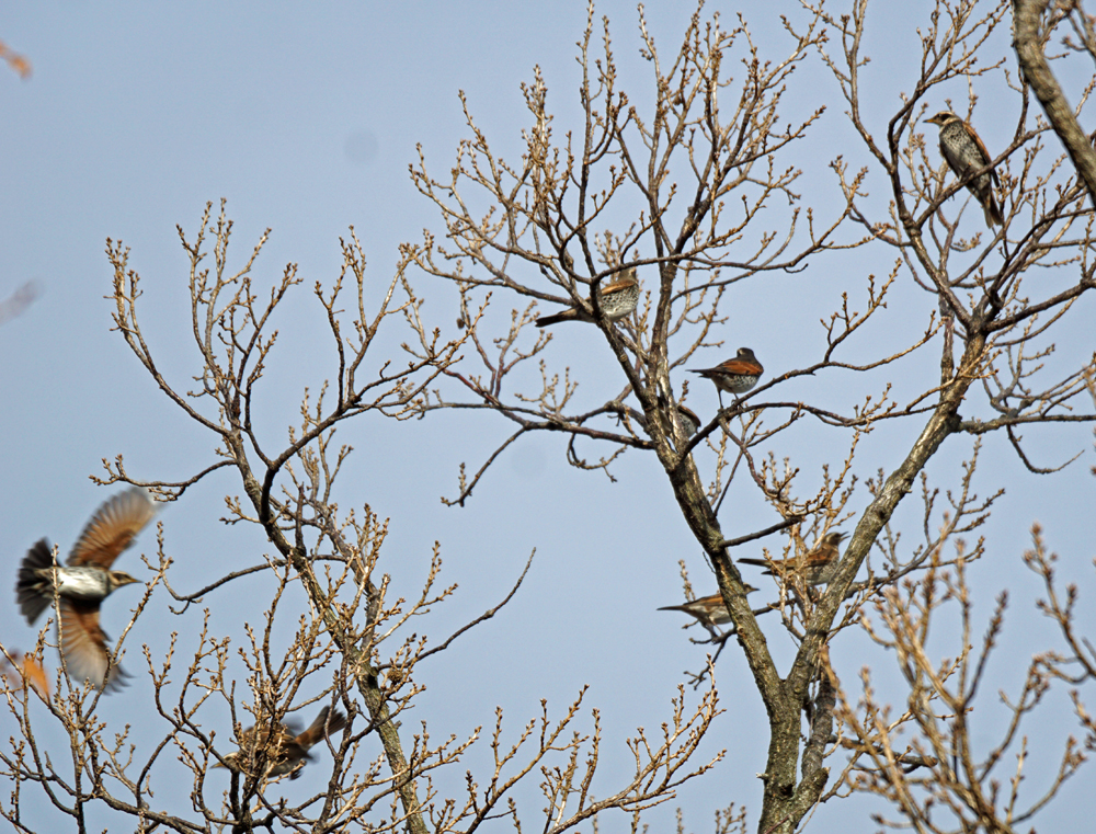 斜面林の方へ行くと、やたらとツグミの声がして、20羽以上の数で林の中をワサワサ動いています。そのうち一群が同じ樹に止まって、飛んで、また別の1群が止まって、飛んで・・・。