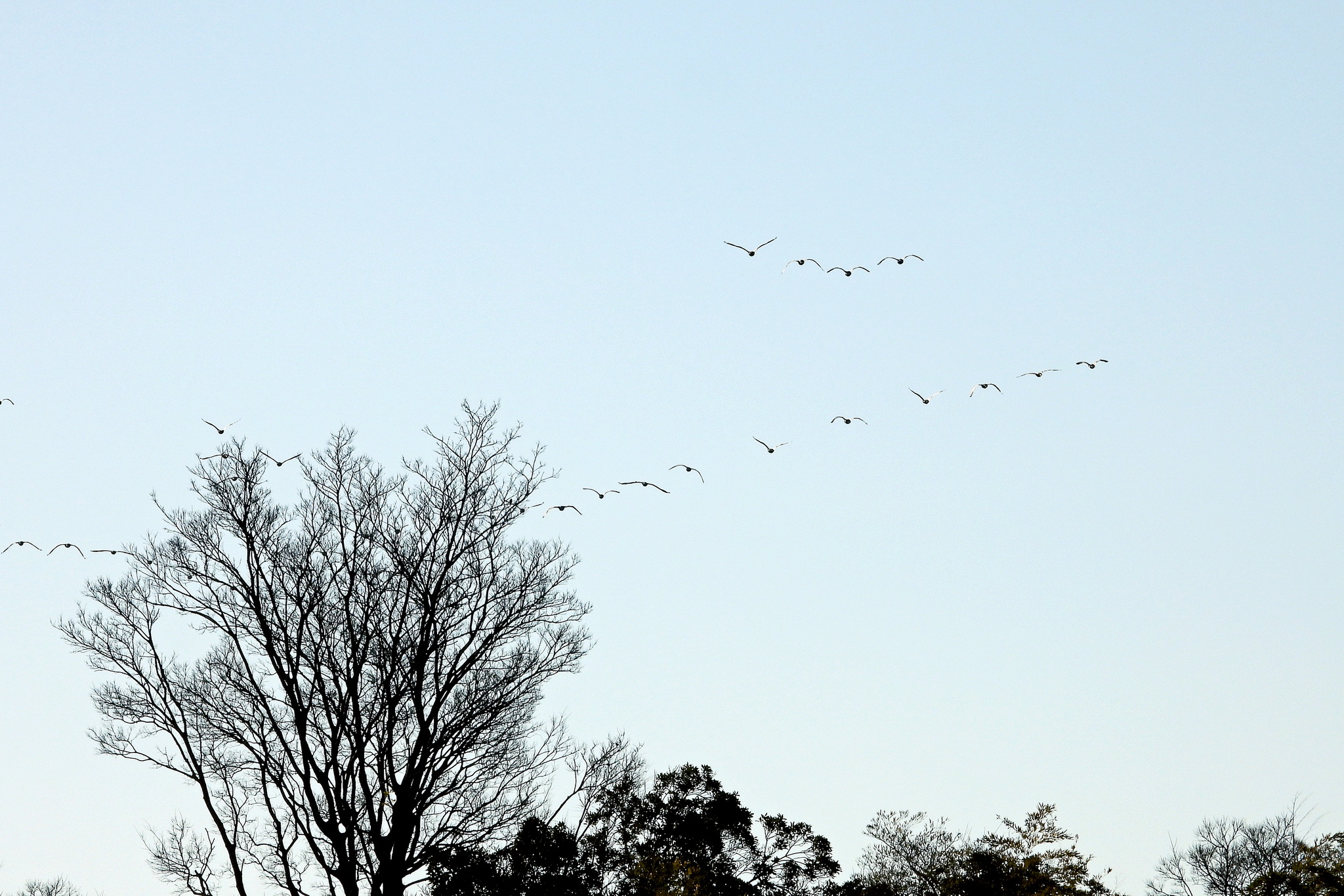 「カワウ」の群れが、下流方向に飛び去って行きます。