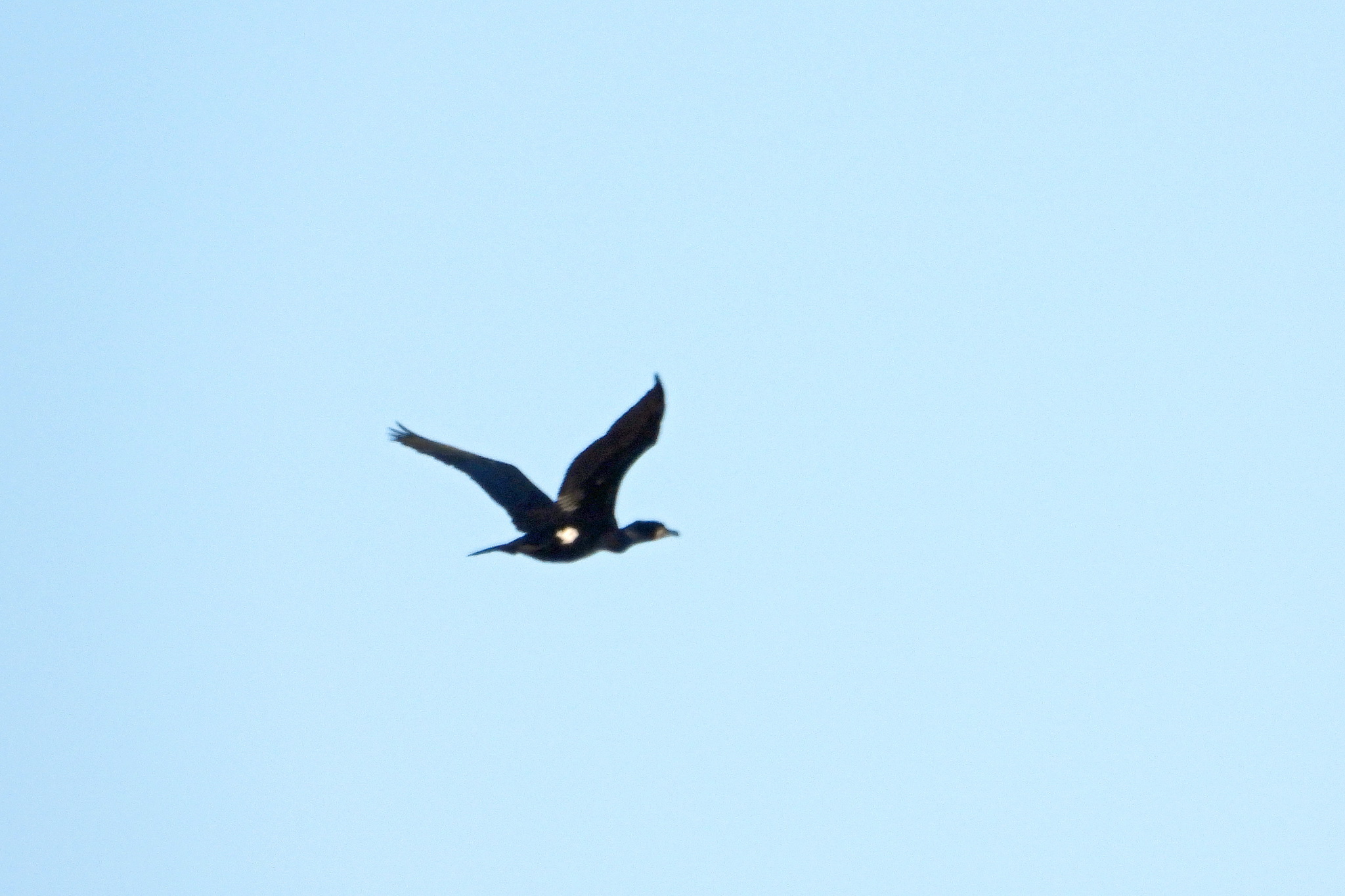 おっ、「カワウ」が一羽上流方向に飛んで行きます。