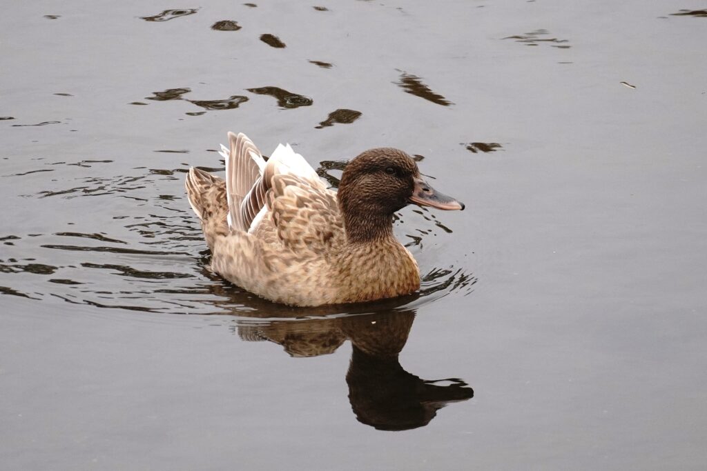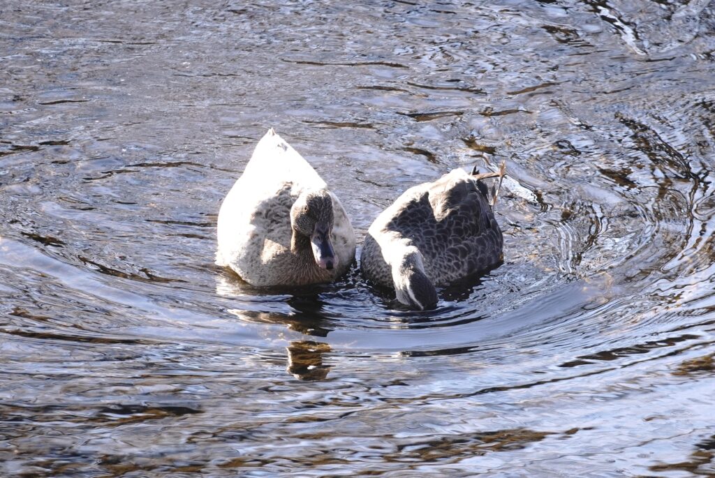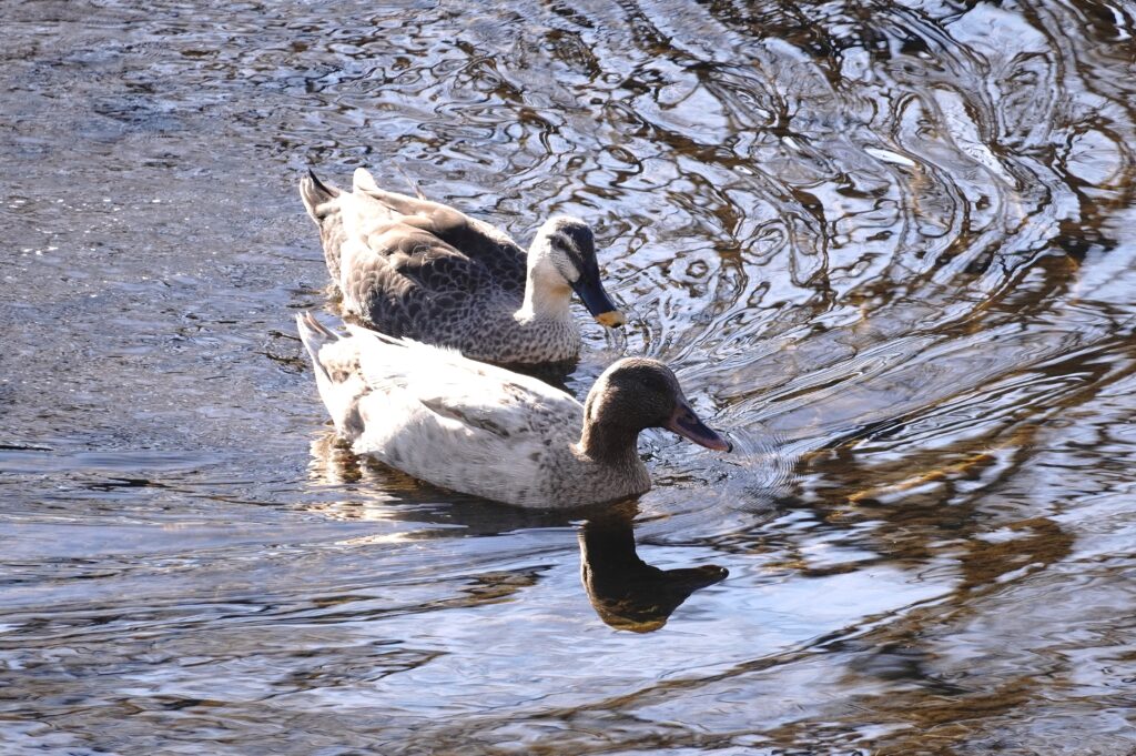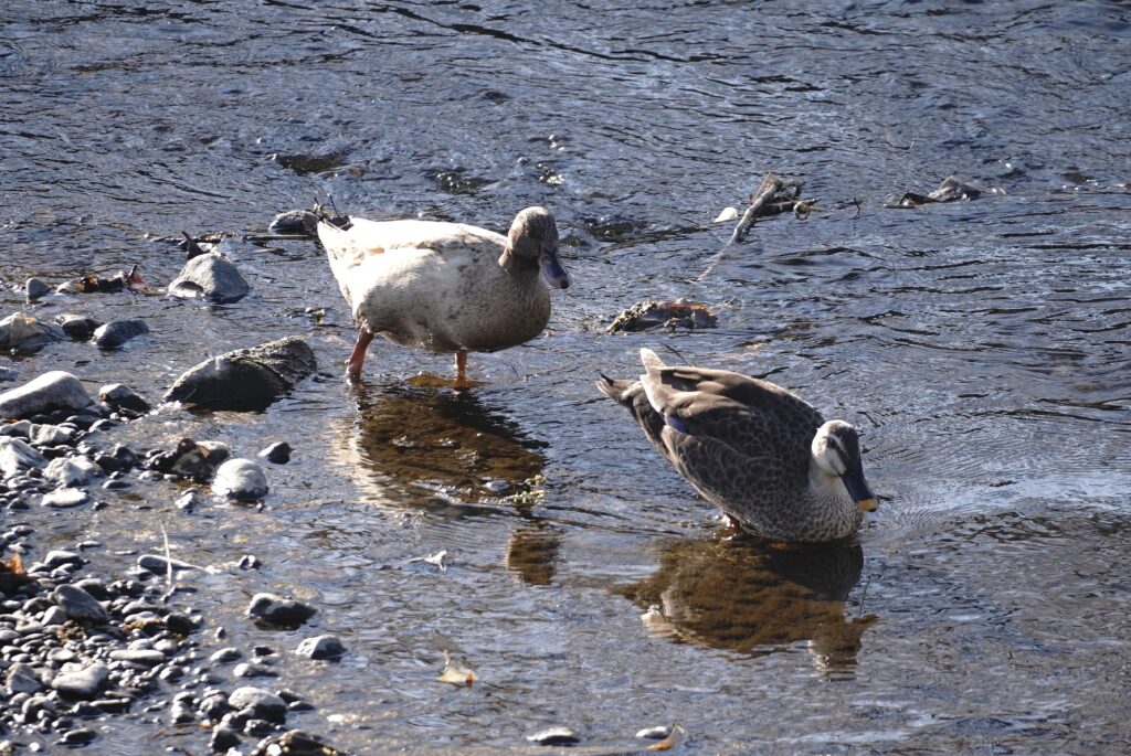 川にはカルガモ(前方)ともう1羽⁇がペアで行動していました