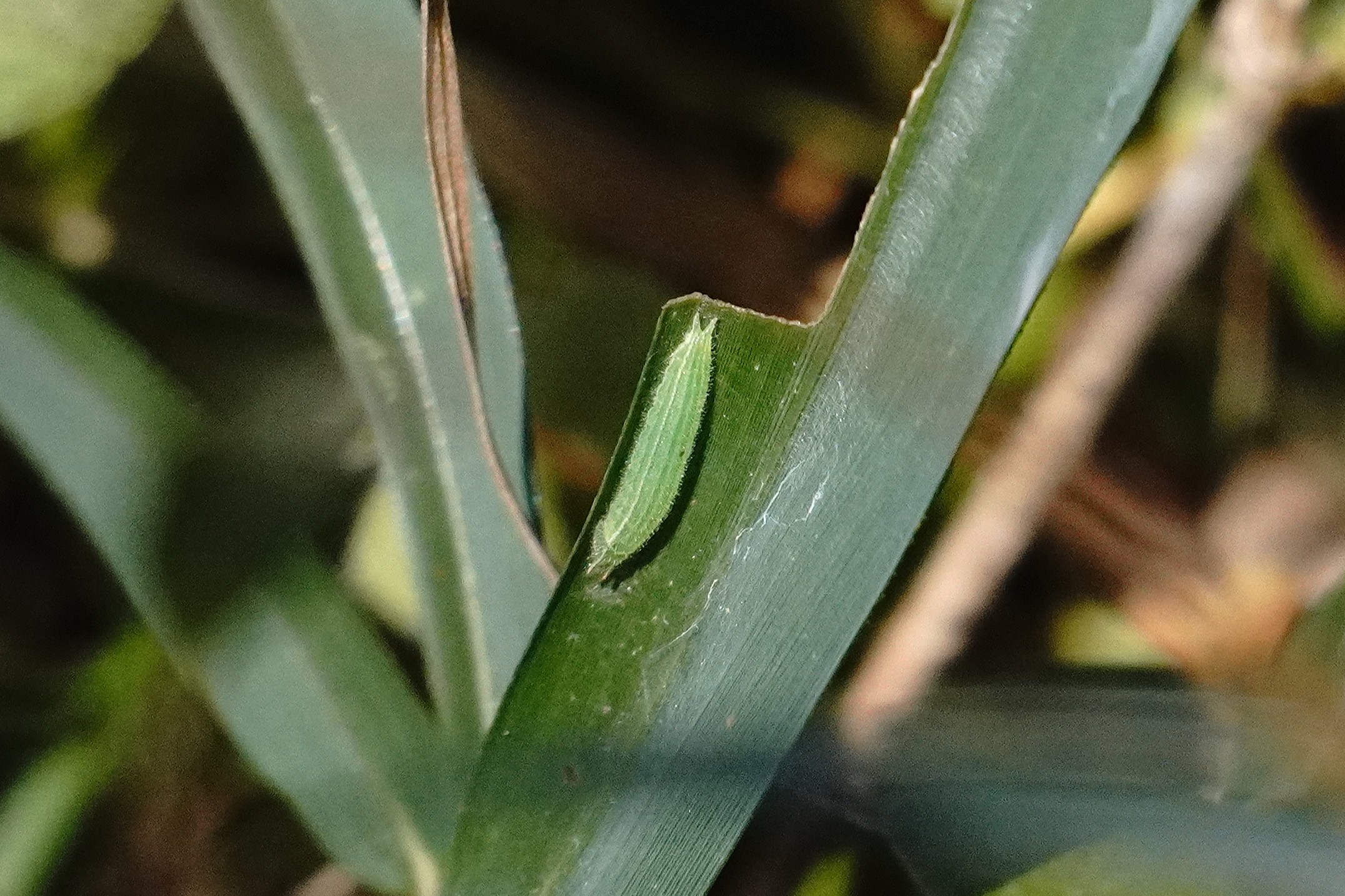 笹の葉に ヒカゲチョウの幼虫 約1センチです