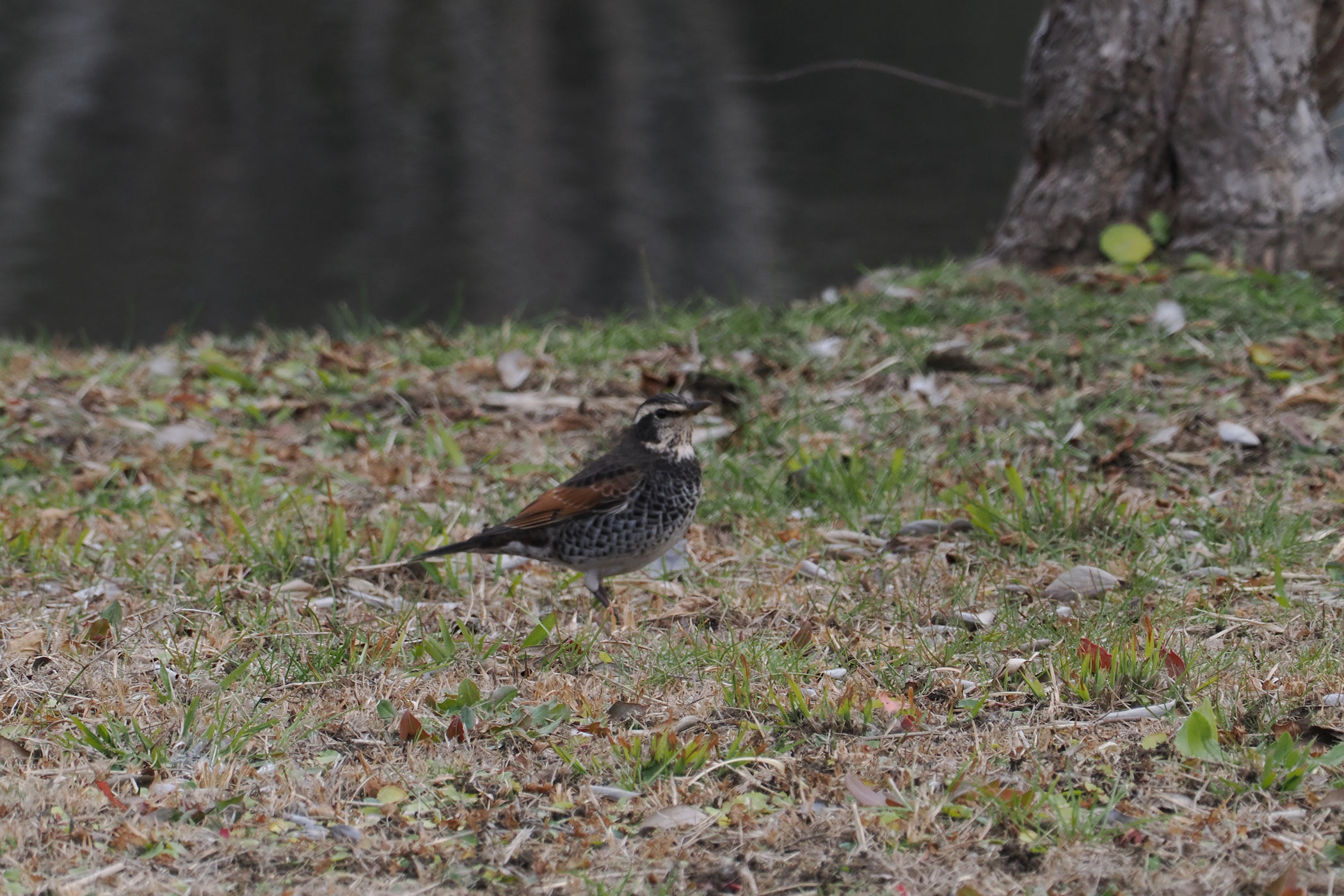 池の中の島ではツグミさんが食事中