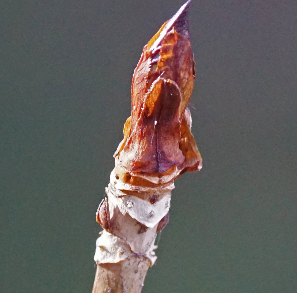 ムクノキの冬芽。 葉痕が、ぽかんと口を開けた、真っ黒顔の子どもの顔に見えます。
