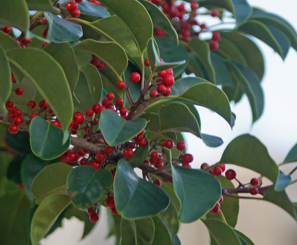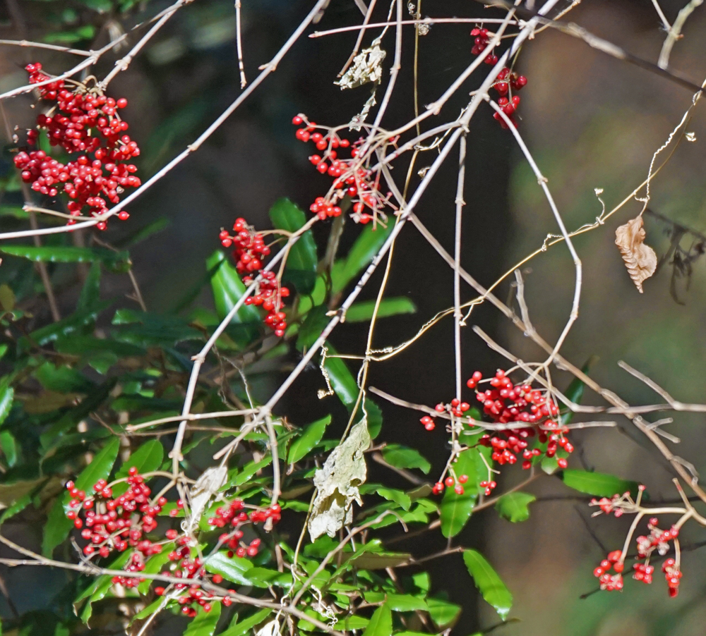ビワ、ヤブツバキ、ノゲシ、オオイヌノフグリ、タネツケバナ、ミチタネツケバナ、ナズナ、コハコベ、ヒメオドリコソウ、ムラサキカタバミ、トキリマメ(実)、ガマズミ(実)、クロガネモチ(実)、ツルウメモドキ(実)など