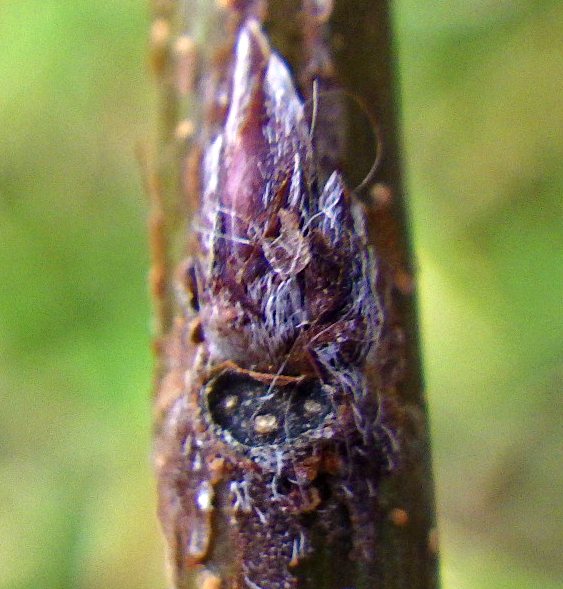 谷戸内にあったアジサイの冬芽。アジサイ類は葉痕が、ちょっとヤギ顔に見える気がします。