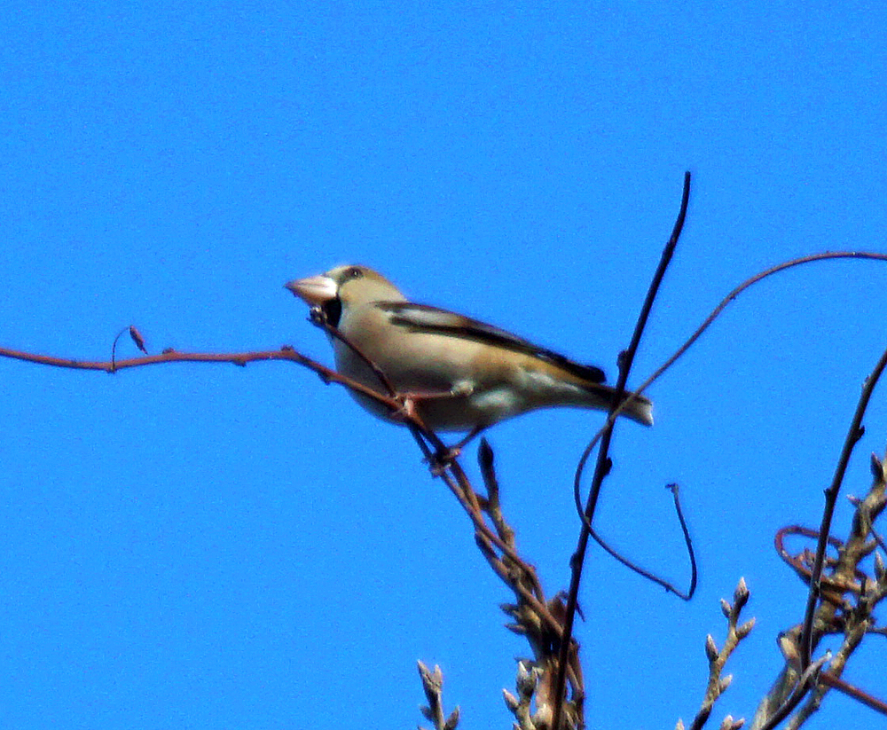 花を探して下ばかり見ながら歩いていましたが、チリッ、チリッ、とシメらしい声がするので、上を見ると、高~い樹の枝先に1羽止まっていました。