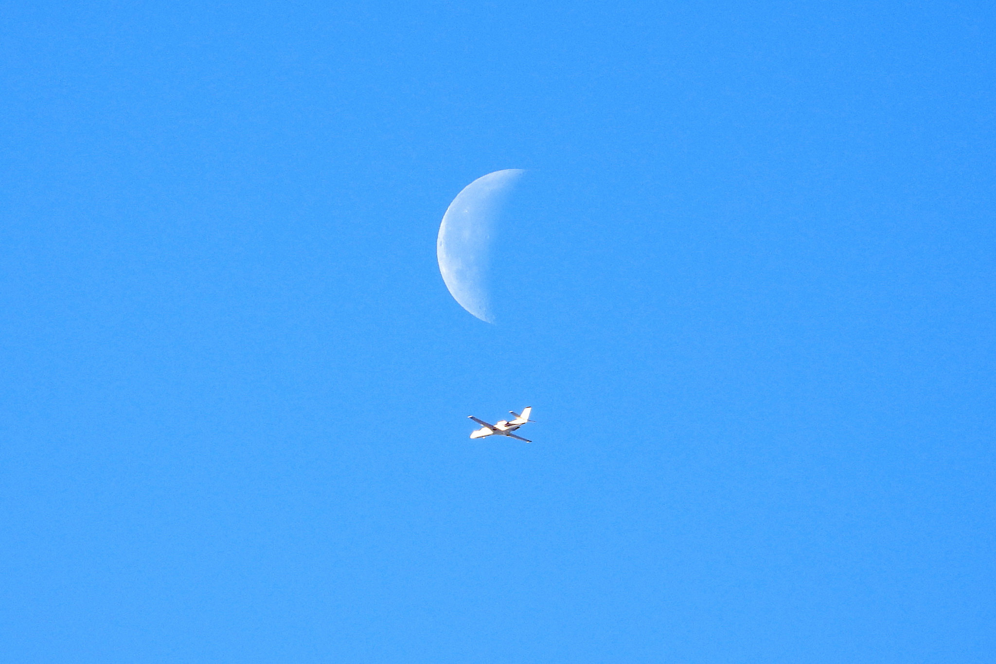 見上げると、なんと、月とジェット機のツーショットではないですか。