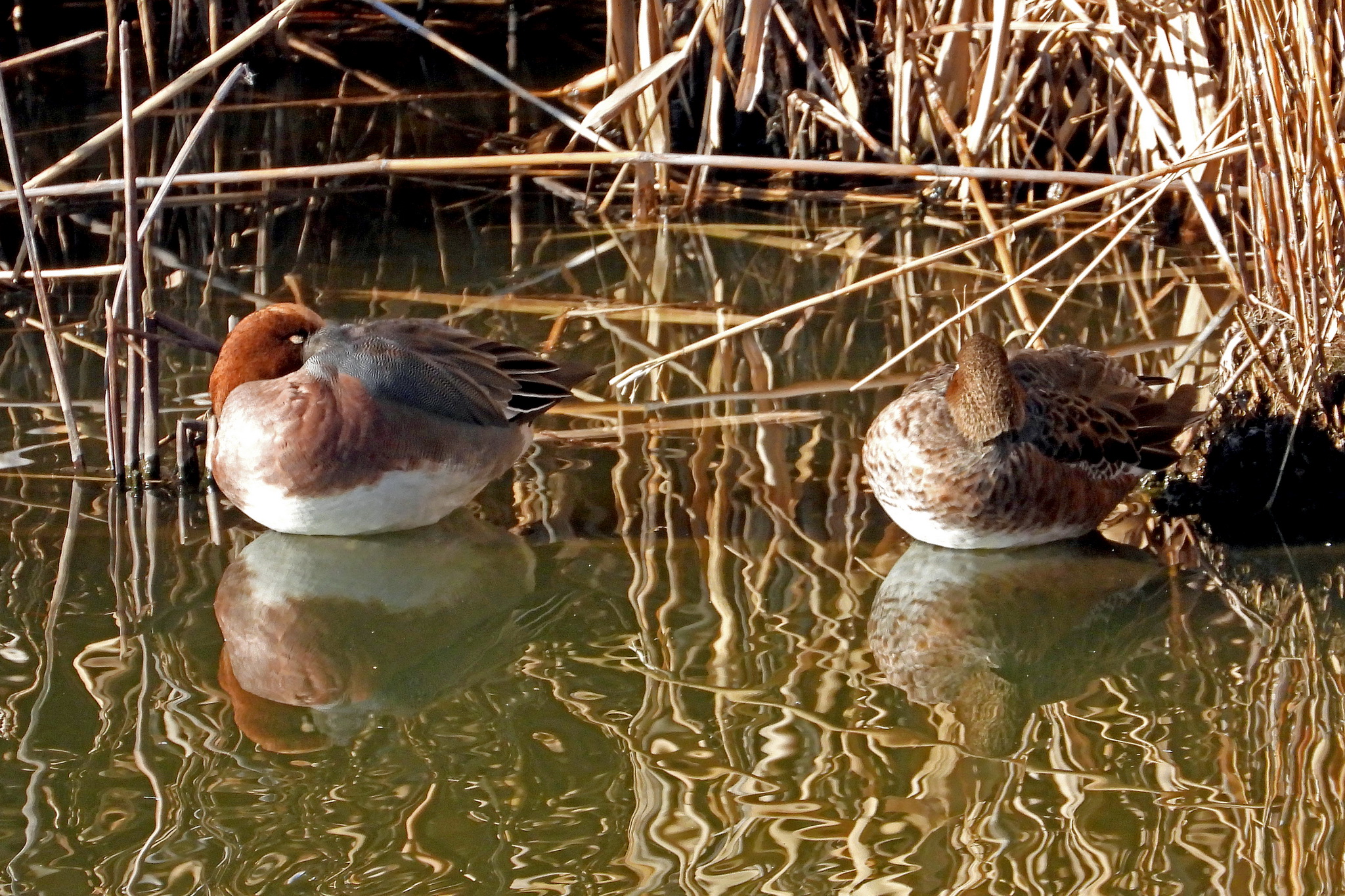 カップルらしき「ヒドリガモ」がうずくまってました。