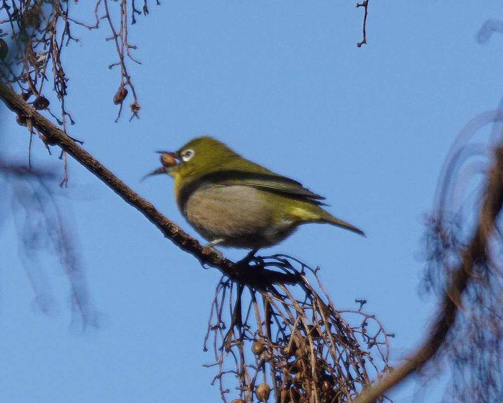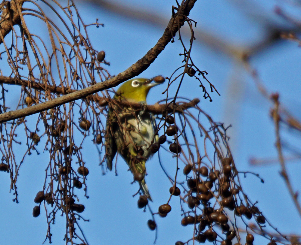 メジロが数羽、ハゼノキに来て、実をパクパクしていました。