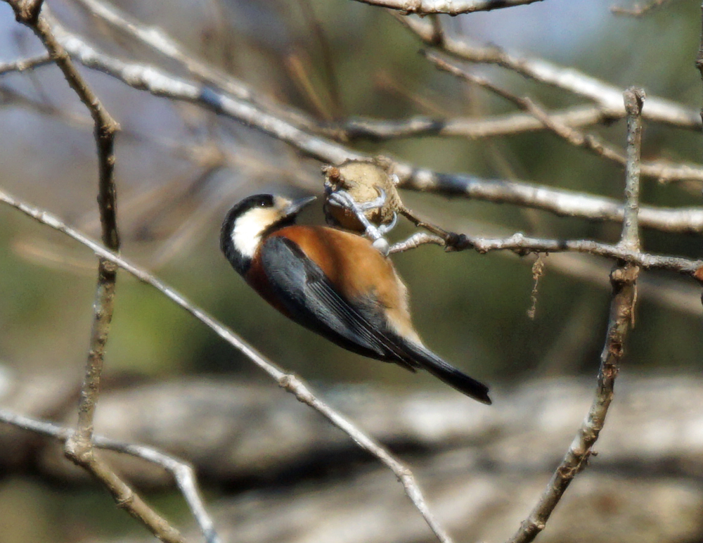 このヤマガラは虫こぶのようなプックリ膨らんだものを啄んでいました。