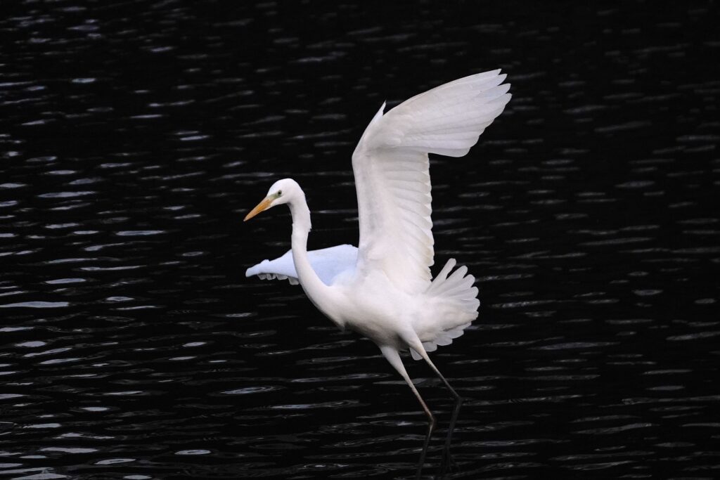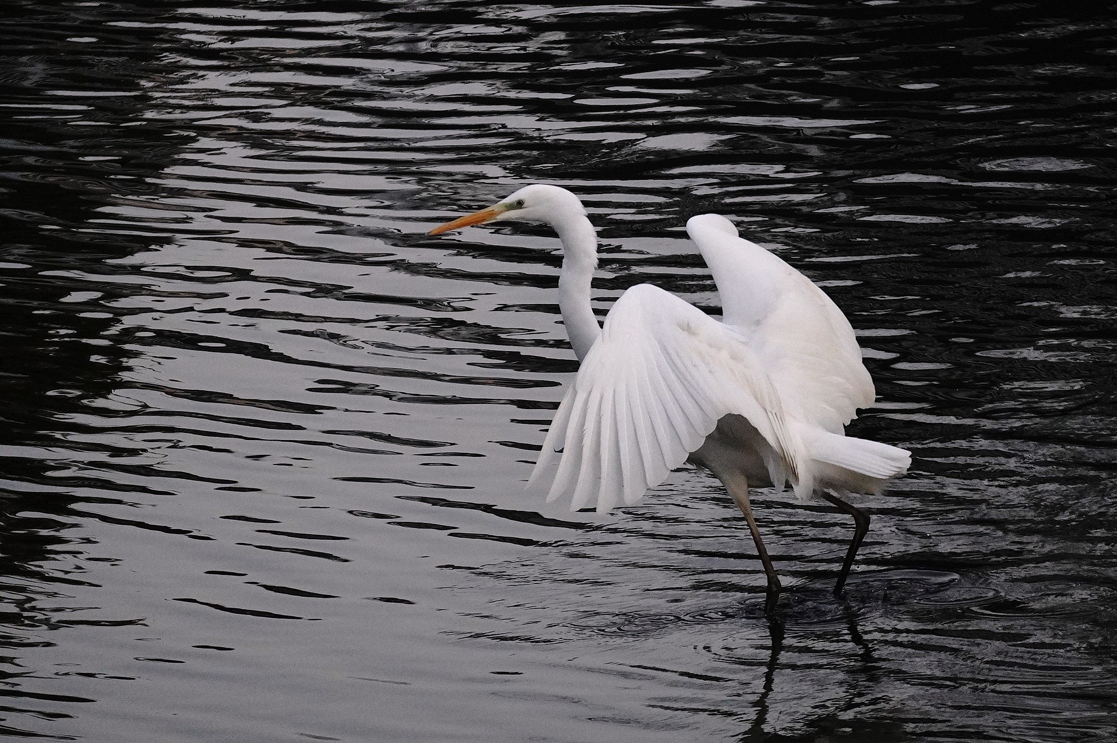 早朝は川には鳥が少なく、ダイサギが空から降りてお出ましです