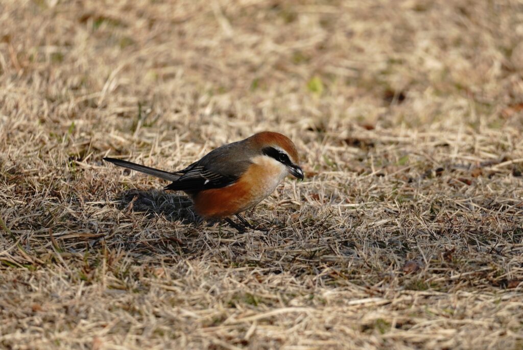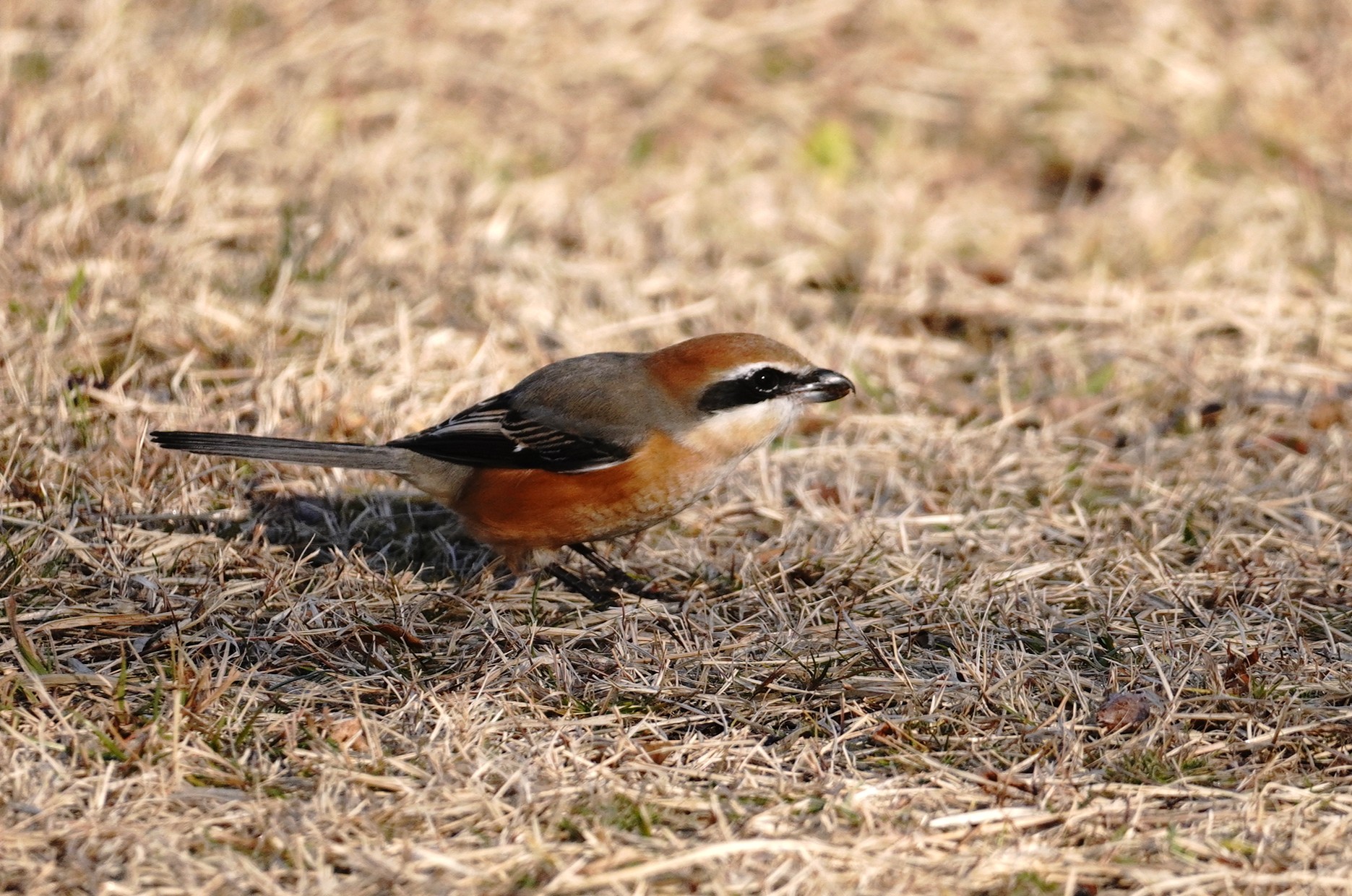 モズ♂ 上の池の縄張り主だと思いますが、なかなかの美男子です そのモズ男君が下に降りて何か口にしました これからお嫁さん探しが始まります しっかり栄養補給しなくてはね