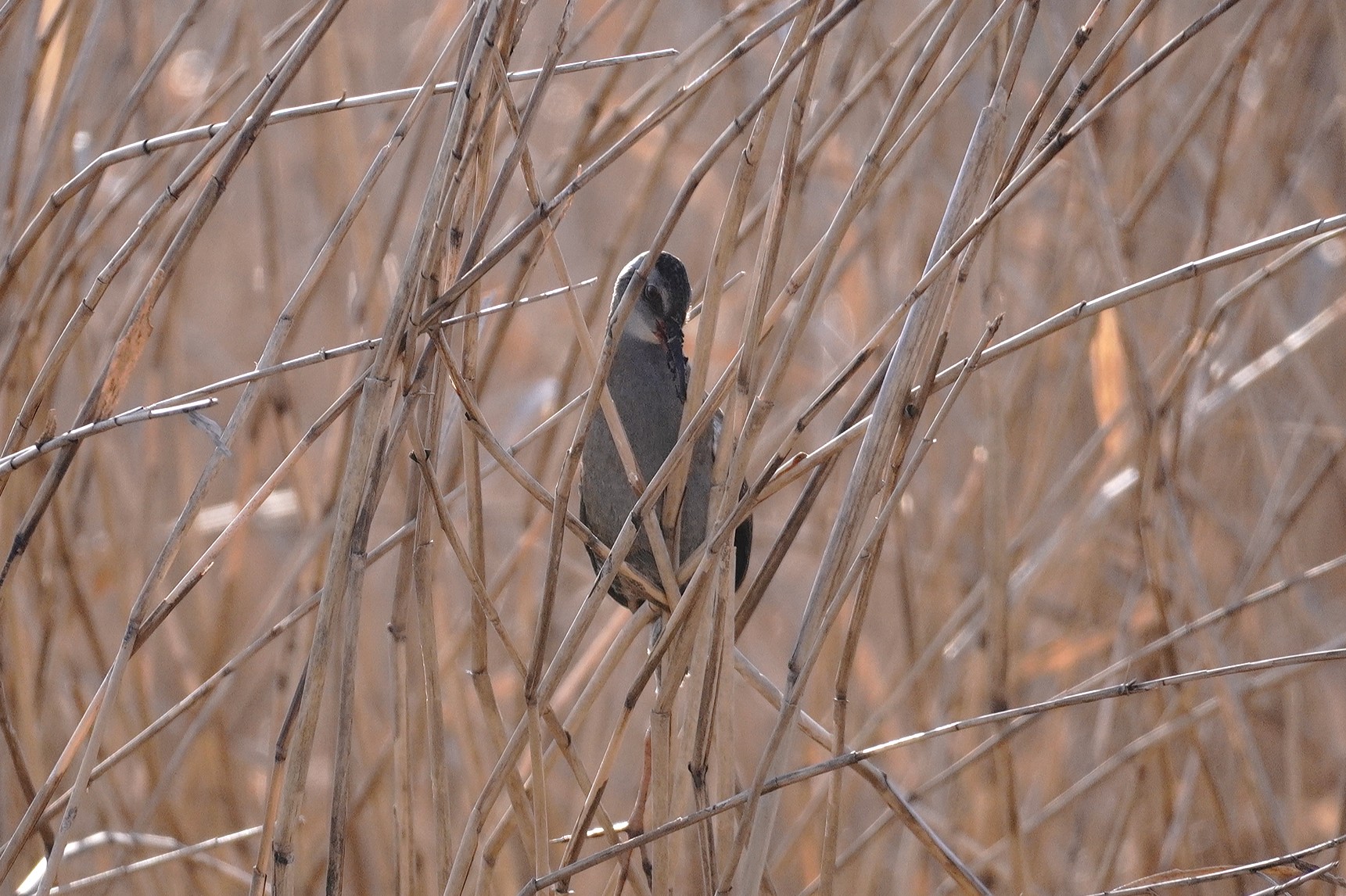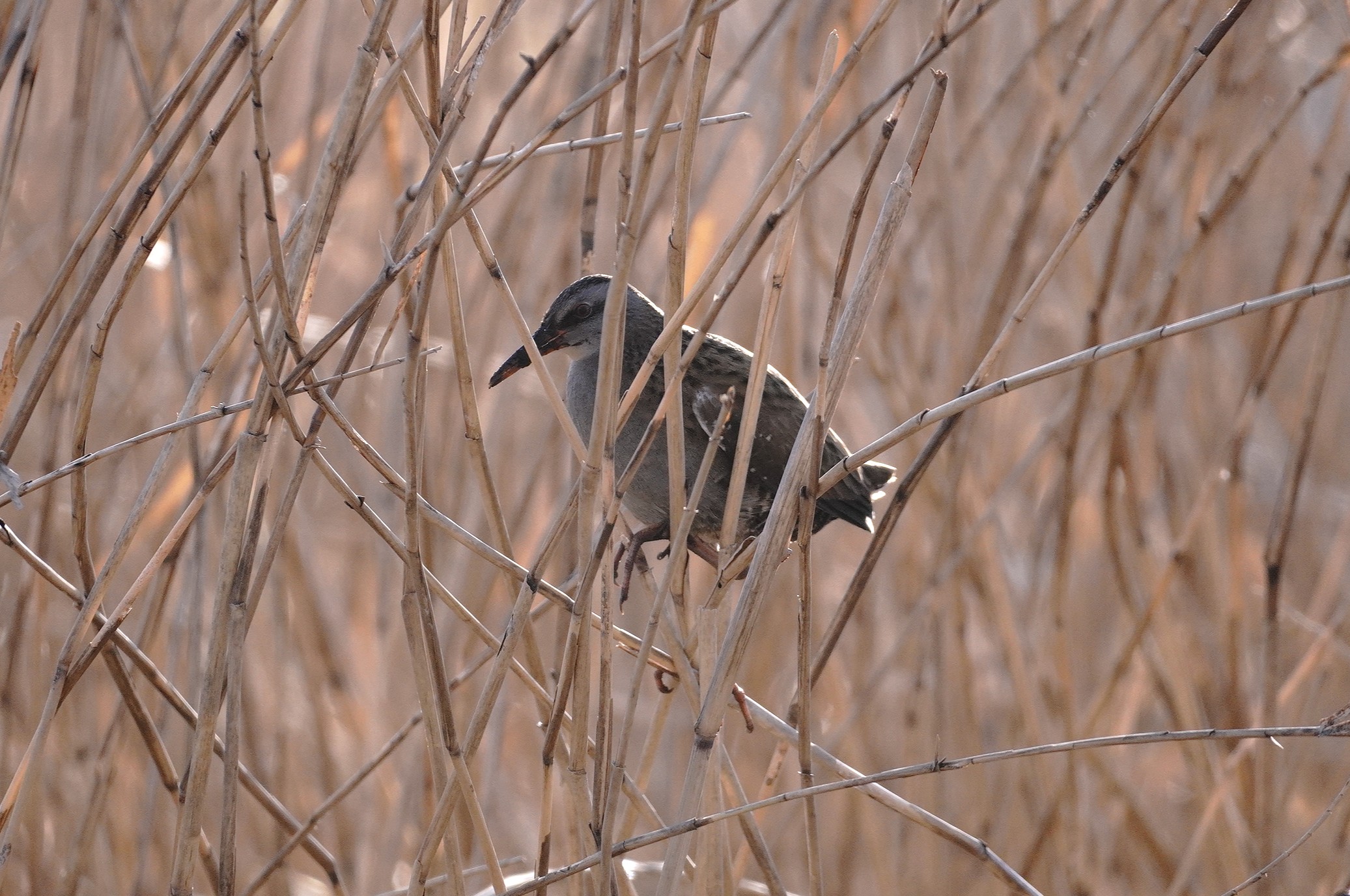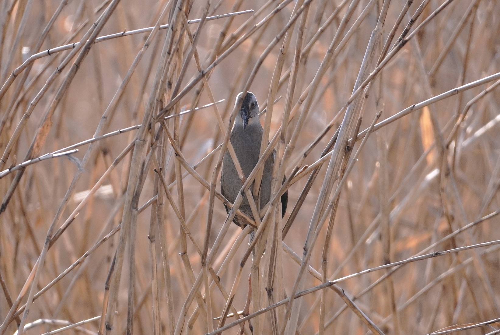 木道脇のヨシの中から大きな声がして、見るとクイナが止まっていました