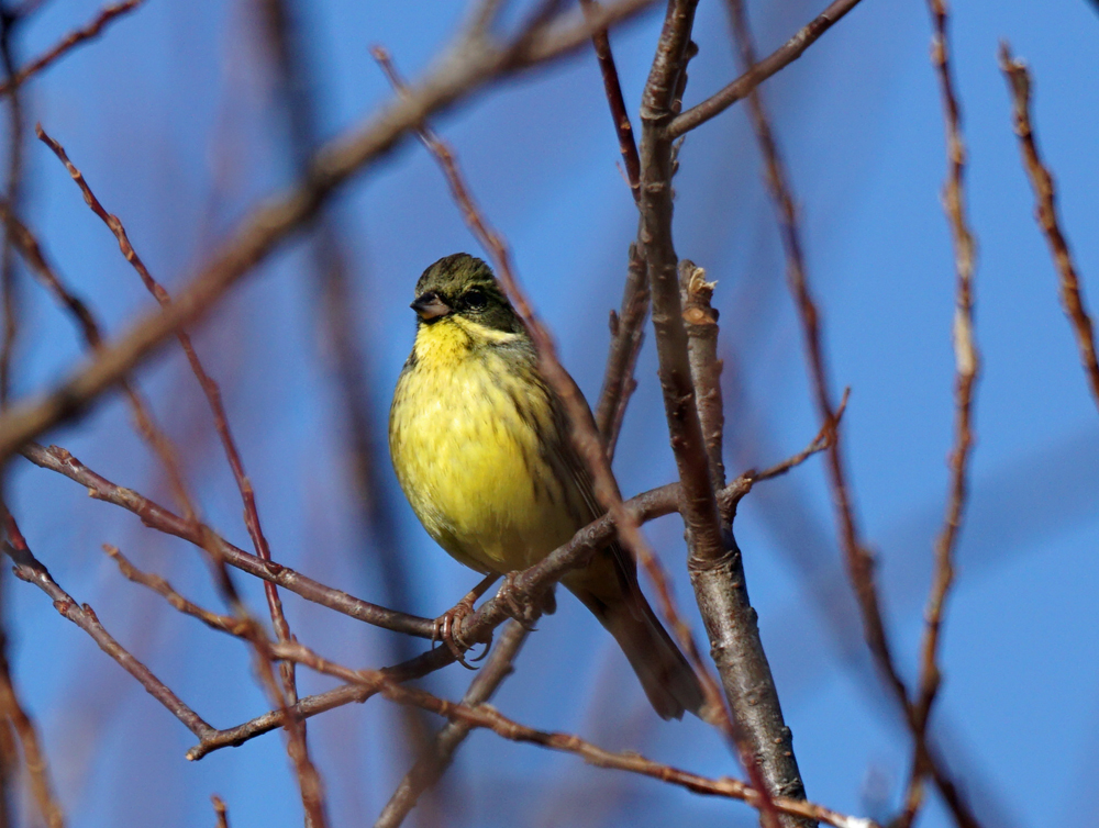アオジ  遠くからお腹の黄色がとてもきれいに見えて、遠目に「あら、何か黄色い実が・・・。」