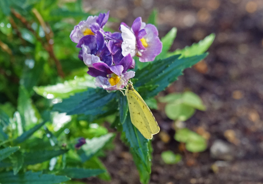 今日も寒中とは思えない暖かさ。 この陽気に誘われたのでしょう、庭にキタキチョウが飛んで来て、ネメシアの花で蜜を吸っていました。