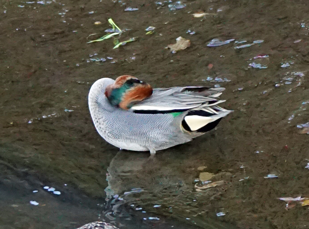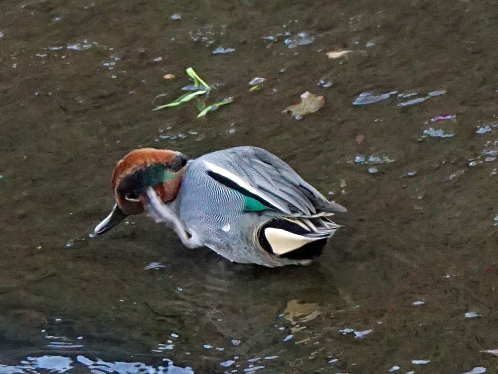 ちょっと小糸川をのぞくと、コガモたちの1羽が、羽繕い&クリクリと頭掻きをしていました。