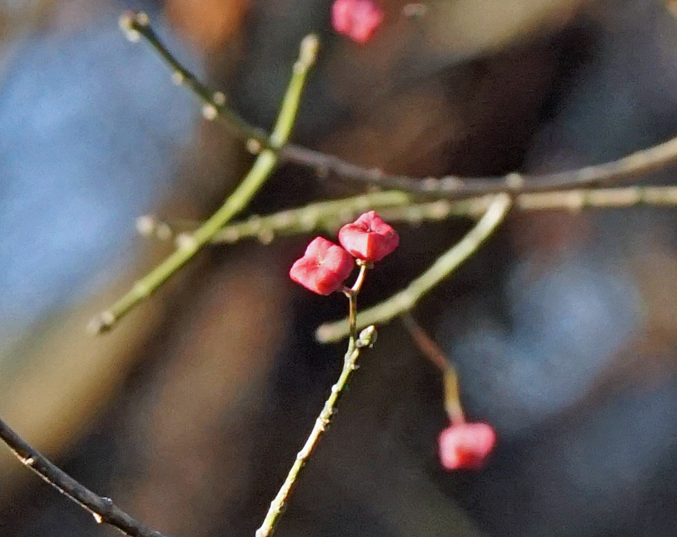 すっかり葉を落としたマユミの枝に、まだきれいな色の実が残っていました。