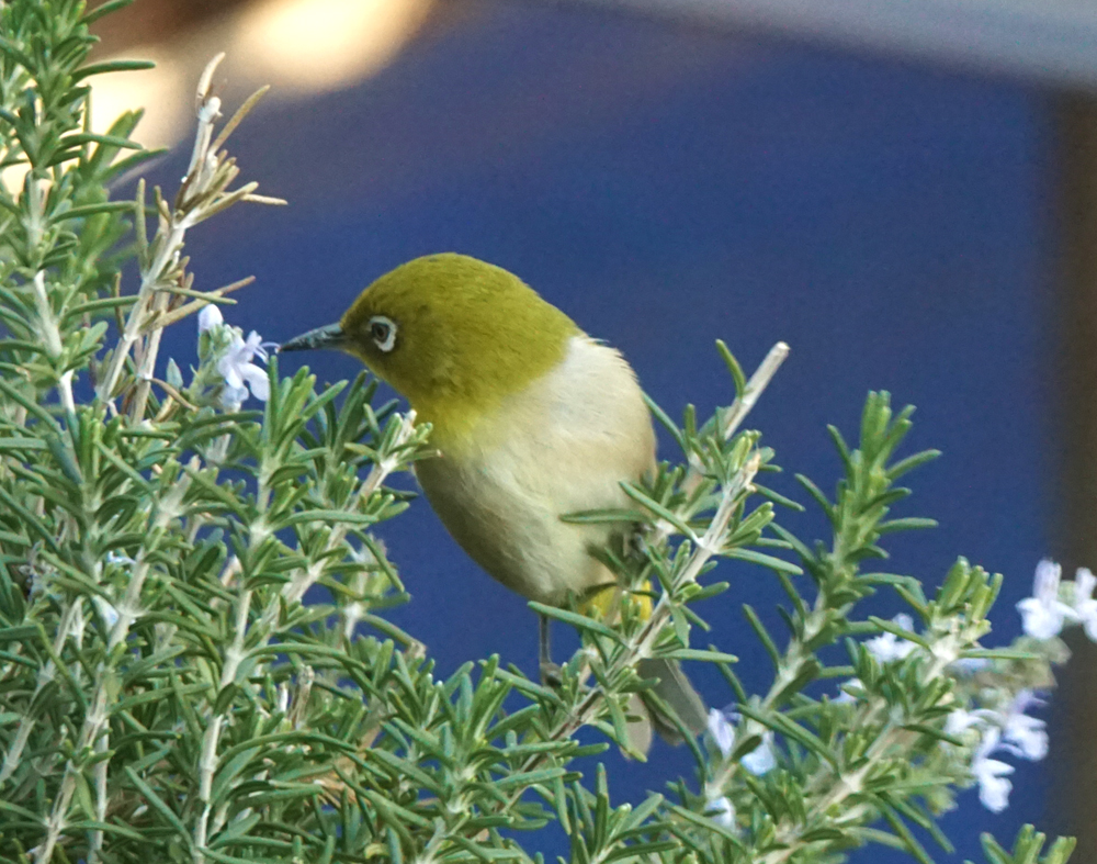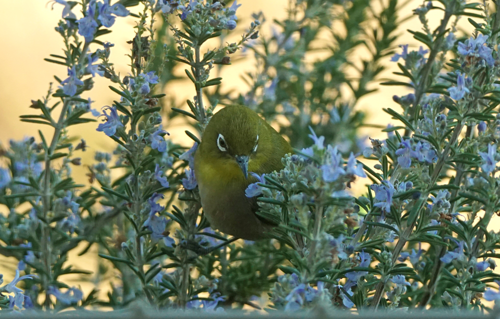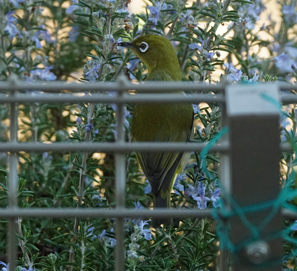 帰宅後、お昼の支度をしていると、キッチンの窓から見えるローズマリに、メジロが5羽やって来ました。支度は中断。(笑) せっせと蜜を吸う様子をしばし楽しみました。