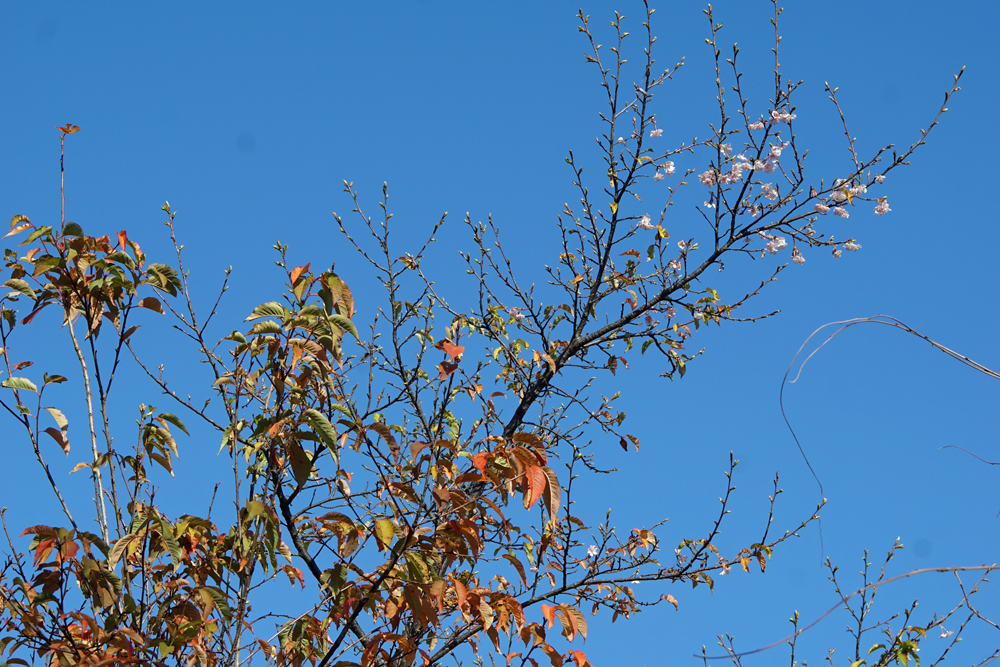 紅葉した葉が残った状態で花が咲いていました。