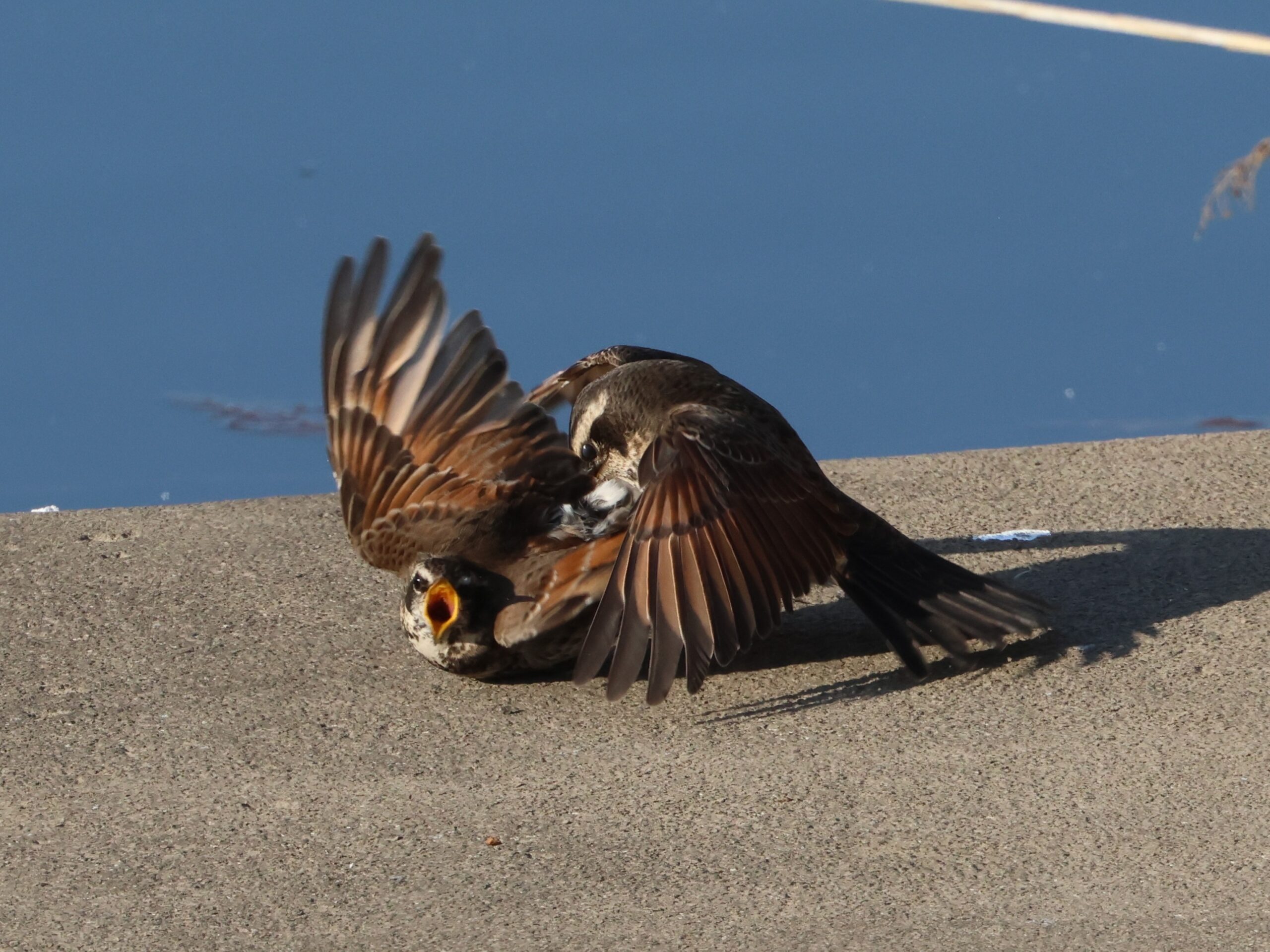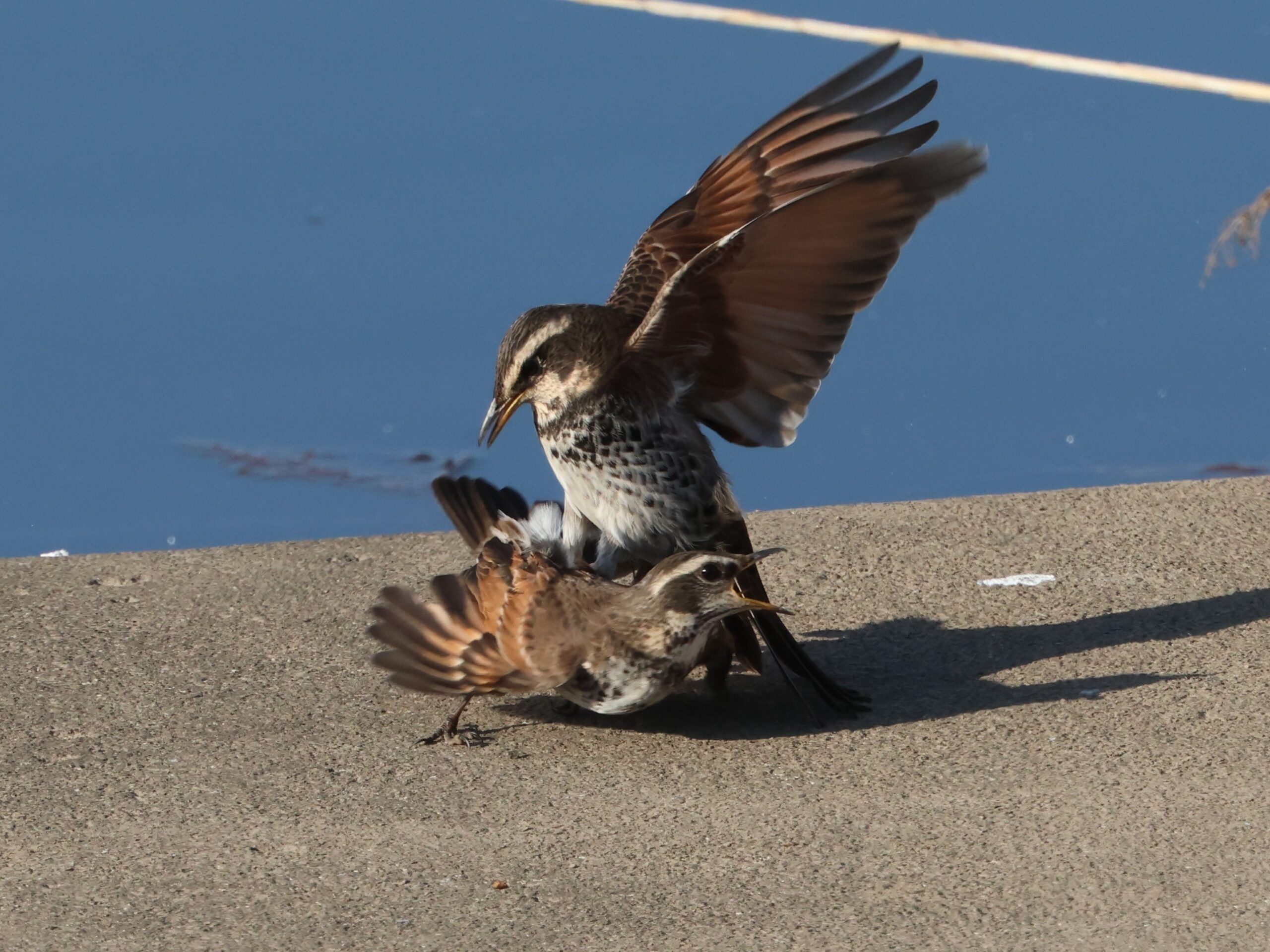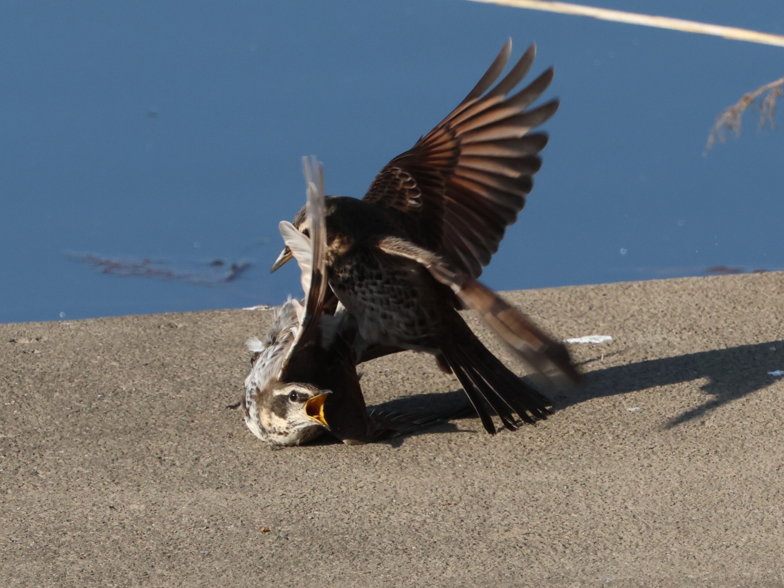 俣野遊水地で1羽のツグミを撮っていたら、新手のツグミが飛来。睨み合った次の瞬間、掴み合いの大バトルになりました。ツグミの決闘、ご覧下さい。