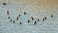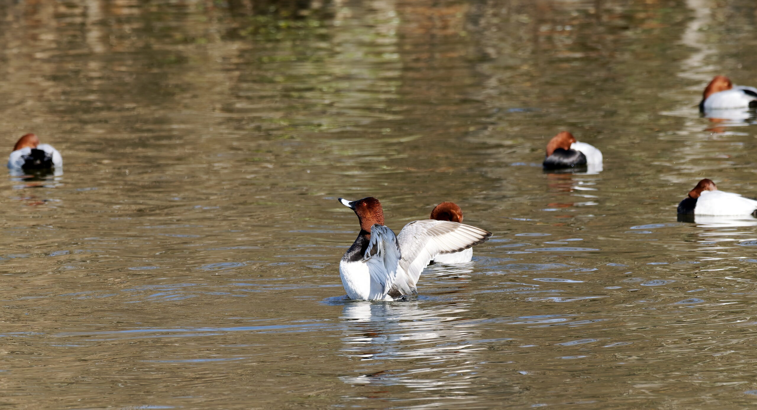 さらに小合溜沿いに歩いて行くとホシハジロの群れ、ほとんど寝てるけど、羽ばたきしているのも